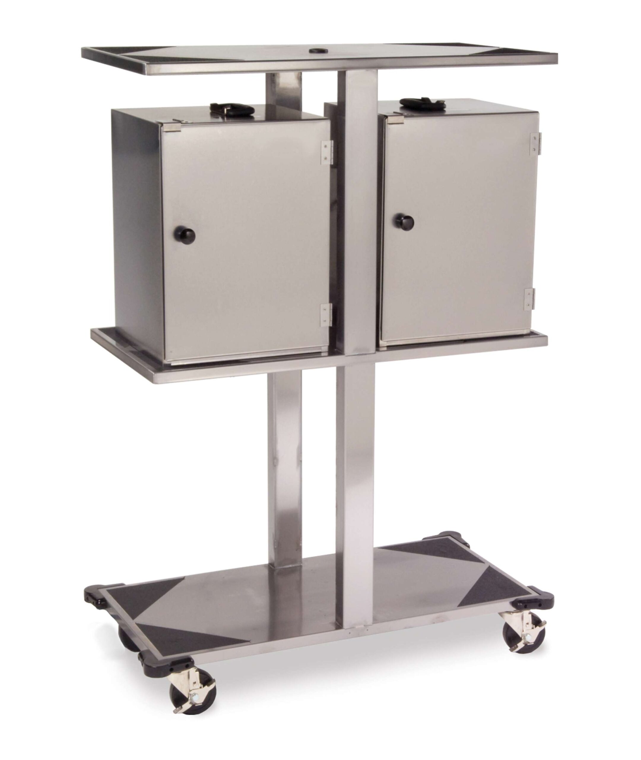 Organize, preheat, and store room service food carrier boxes. The Geneva 74550 Carrier Box Rack is designed with solid fuel boxes. This unit is durable and easy-to clean stainless steel welded construction. Accommodates up to six food carrier boxes. The flat shelves are easy loading/unloading. Non-slip corner pads on shelves. This model has a rugged steel dolly base for extra durability. 4” diameter all-swivel (2 ea. with brake) for easy movement. Made in the USA.