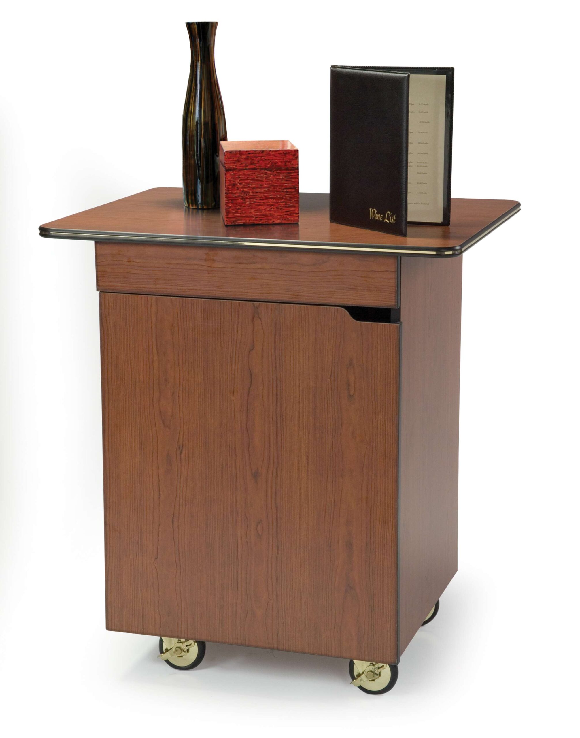 Enclosed Serving Station 66112 by Lakeside/Geneva has (1) fixed interior shelf, pull-out drawer, hinged door, and laminate finish with an interior that measures 23" wide. The laminate construction is durable and easy to clean and sanitize. It has a 23" wide interior with the compartment measuring 19-1/2"D x 22-1/2"W x 26-1/2"H with a centered fixed shelf. This cart's high impact edge molding protects corners of cart during contact with walls and furniture. It is equipped with no-mark 4" swivel casters, 2 ea. with brake provide smooth maneuverability around tight spaces. Choice of 10 laminate finishes. Modify or custom-build with no minimum orders. Superior lead times. Geneva by Lakeside Manufacturing products are proudly made in the USA.
