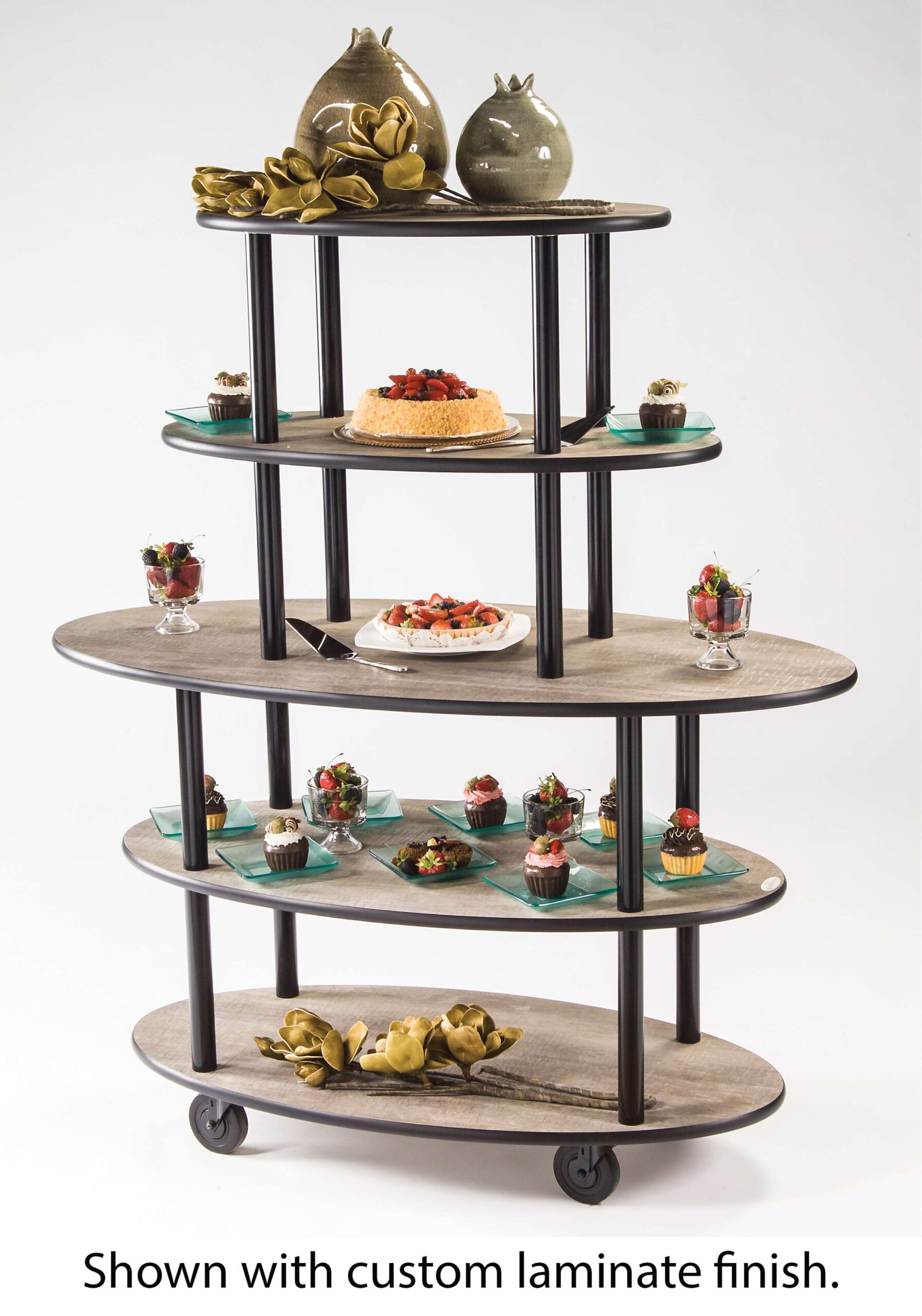 Dessert Carts by Geneva showcase and enhance decadent sweets and gourmet cheeses that capture guests' cravings and add on sales. The Geneva 37212 Dessert Cart with rounded oval top and shelves has (1) top shelf measuring 16-3/4" x 28" and (1) upper middle shelf measuring 16-3/4" x 34". This cart's durable laminate construction is easy to clean and sanitize. Its high impact edge molding provides protection to vulnerable edges of cart. This dessert cart's 1-1/2” dia. brass or epoxy powder coated steel legs provide strength to where cart is vulnerable to stress. Its no-mark, 4” swivel casters provide smooth maneuverability around tight spaces. This Geneva cart's shelves provide convenient storage space for plates, glasses, utensils, condiments, and other items for efficient serving. Ideal for decadent chocolates, desserts, breakfast pastries, cheese, assorted baked goods. Choice of 10 standard laminate finishes in popular woodgrains and textures. Modify or custom-build with no minimum orders. Superior lead times. Geneva Designs by Lakeside Manufacturing products are proudly made in the USA.
