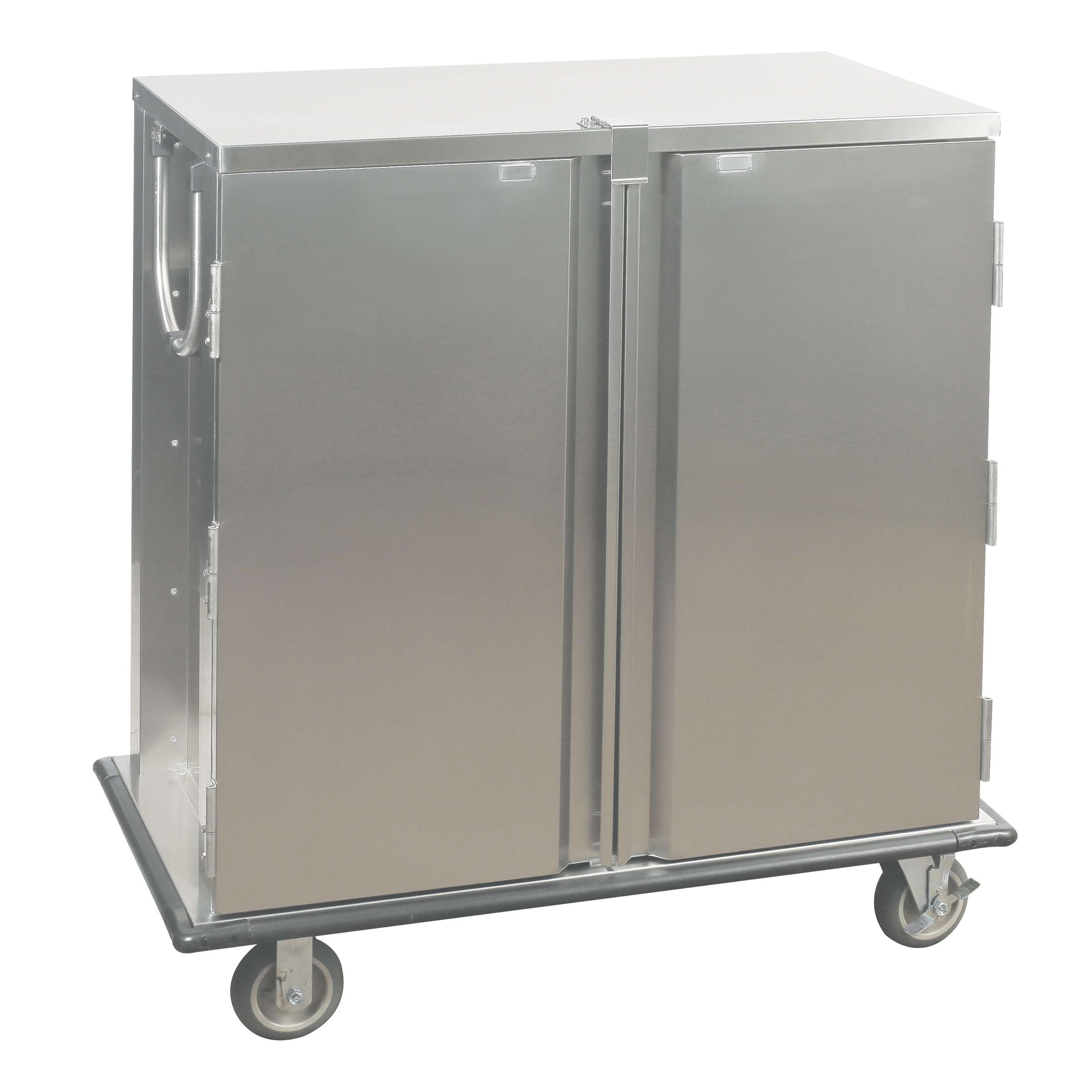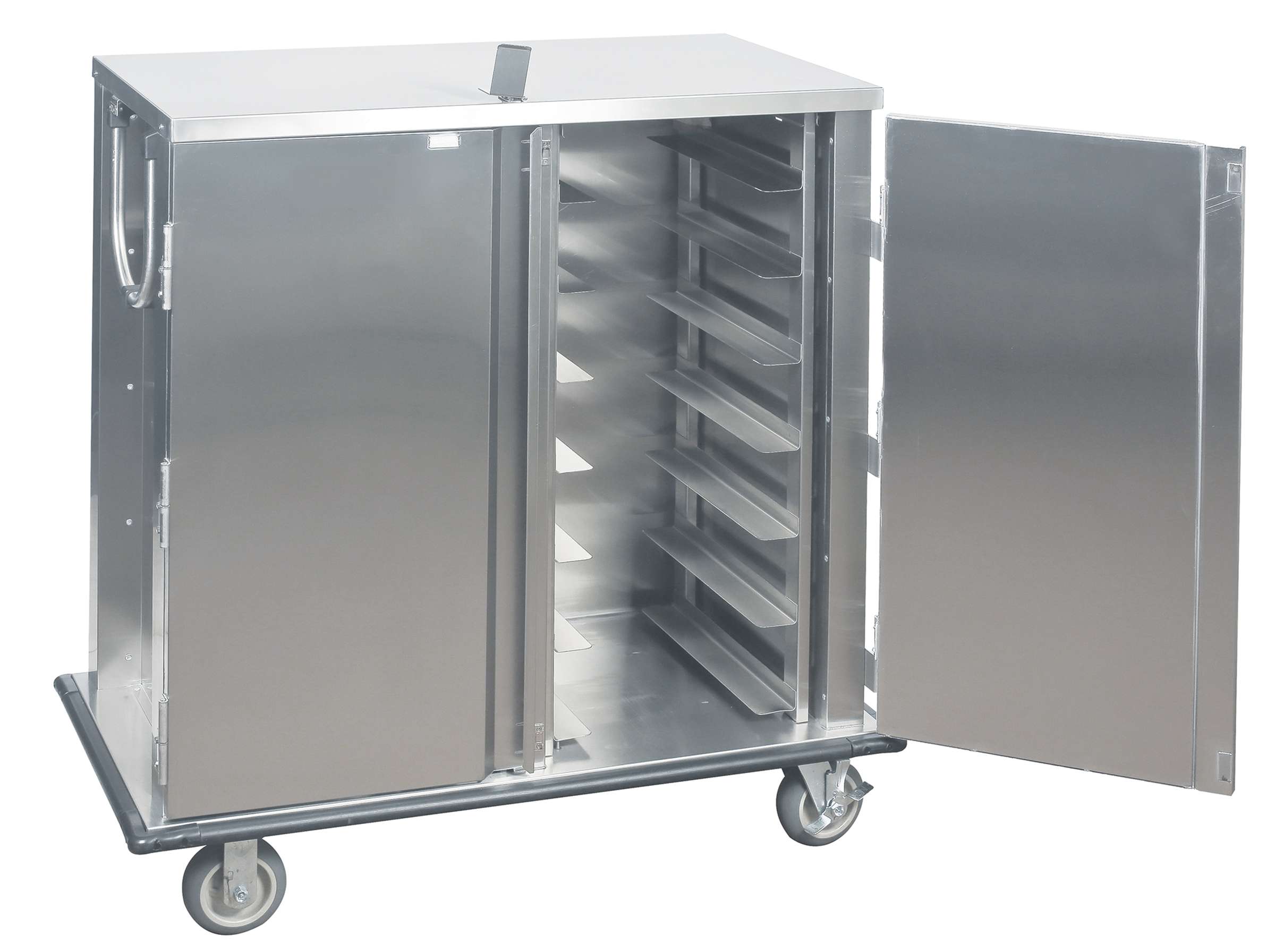 The Alluserv/Lakeside TC21-14 Elite Tray Cart has 2 compartments with 1 tray per ledge and a 14 tray capacity. This unit accommodates 14" × 18" and 15" × 20" trays and features U-shaped vertical push bars on both ends for easy handling. It offers a 5 1/2" ledge space and includes a pull-type door with magnets and a transport latch for secure closure. The unit maneuvers on 6", 2"-wide casters—two swivel with brakes and two fixed—and is built with all-stainless-steel construction. It is available in high-capacity and narrow-profile models and includes offset-mount casters for improved stability and movement. Nobody beats Lakeside lead times! Proudly made in the USA.