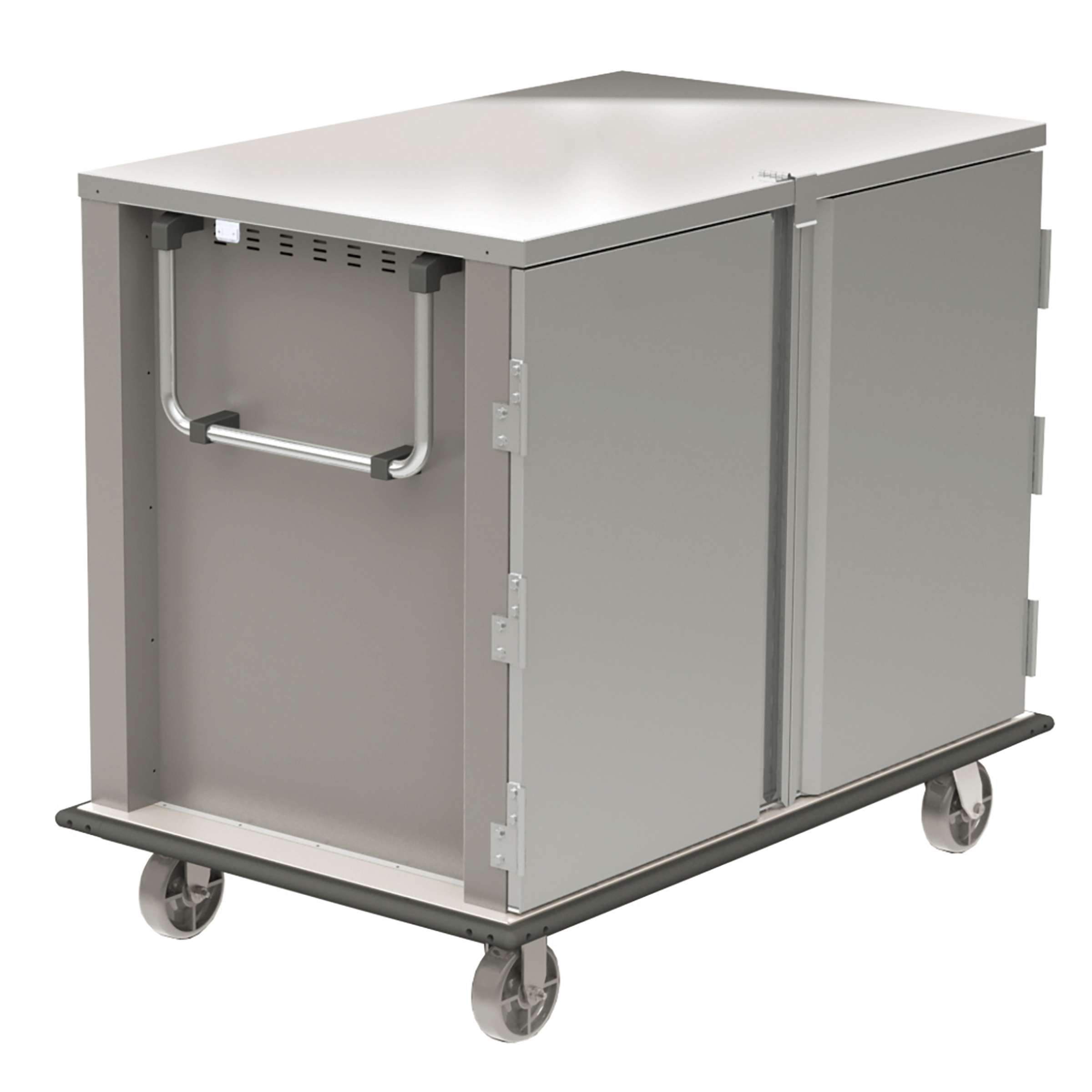 The Alluserv/Lakeside TC22-24 Elite Tray Cart has 2 compartments with 2 trays per ledge and a 24 tray capacity. This unit accommodates 14" × 18" and 15" × 20" trays and features U-shaped vertical push bars on both ends for easy handling. It offers a 5 1/2" ledge space and includes a pull-type door with magnets and a transport latch for secure closure. The unit maneuvers on 6", 2"-wide casters—two swivel with brakes and two fixed—and is built with all-stainless-steel construction. It is available in high-capacity and narrow-profile models and includes offset-mount casters for improved stability and movement. Nobody beats Lakeside lead times! Proudly made in the USA.