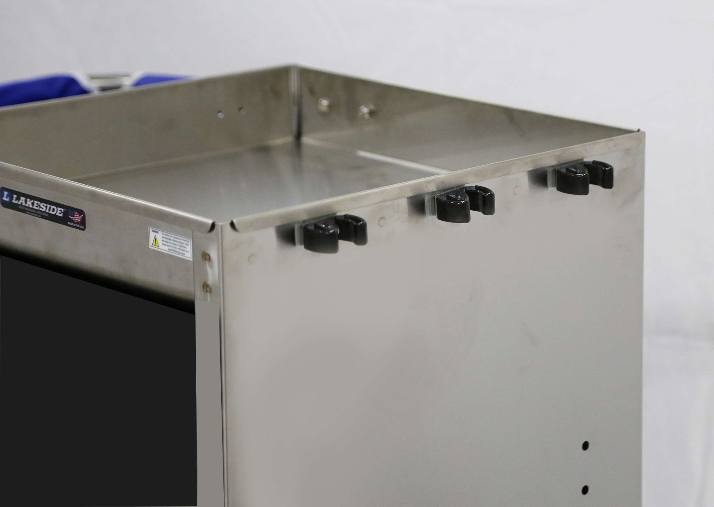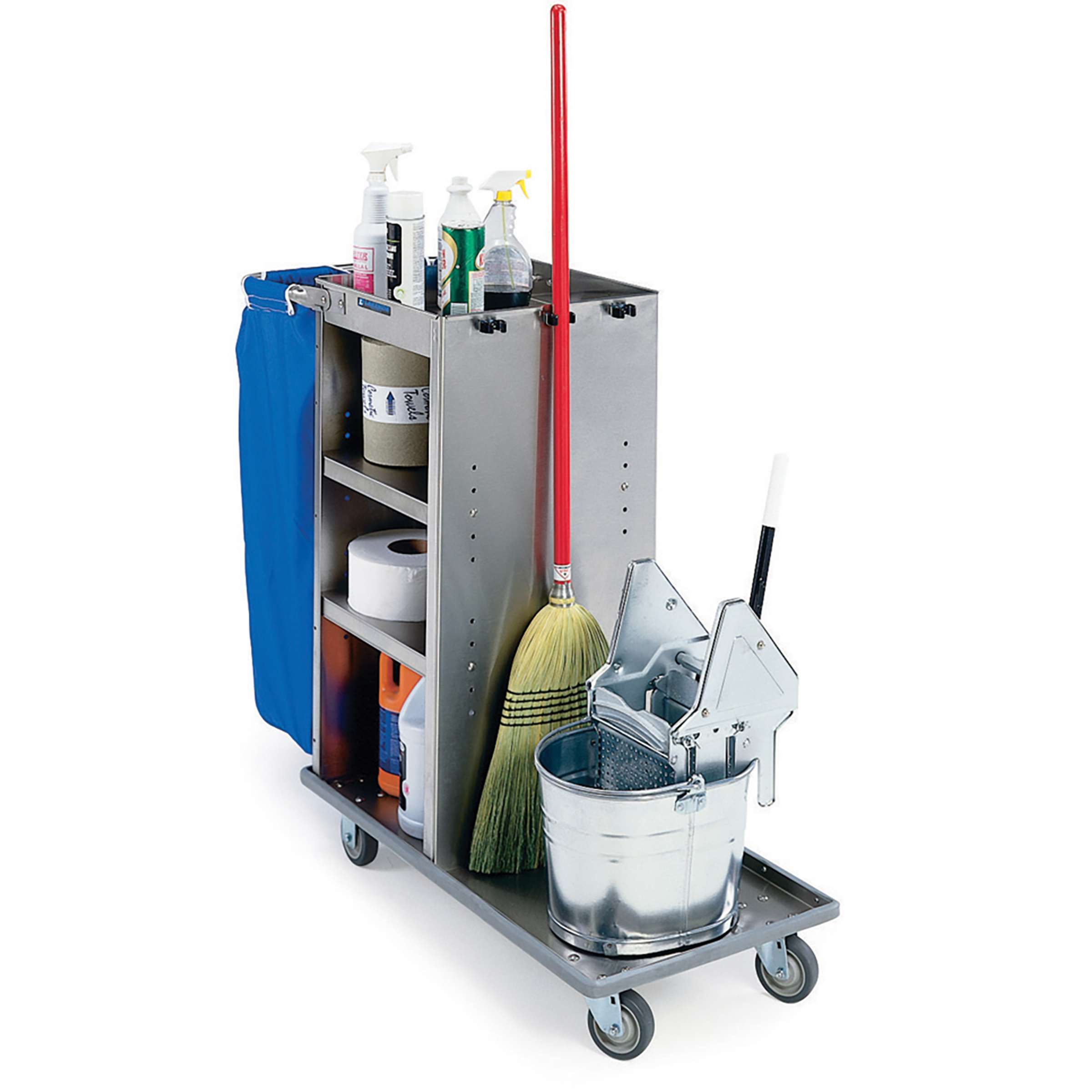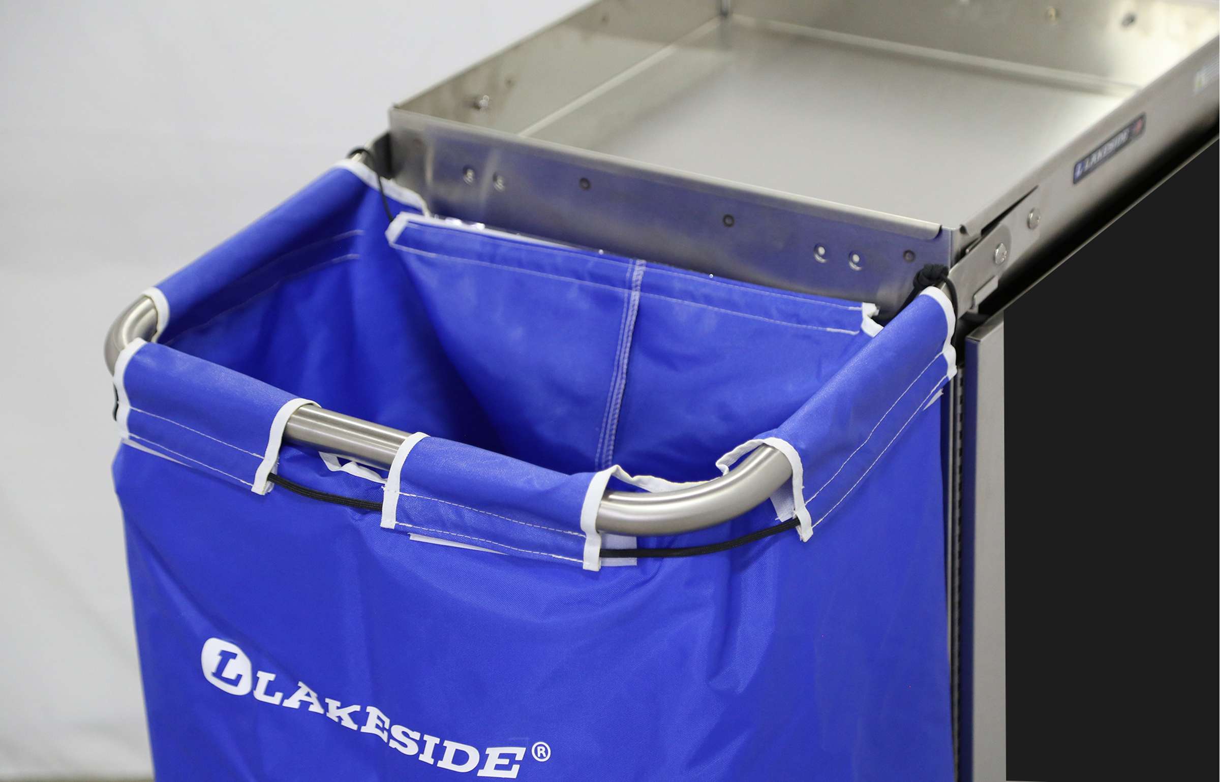 Housekeeping Carts by Lakeside Manufacturing are versatile and efficient designed to assist housekeeping staff in transporting cleaning supplies. The Lakeside 53570 Fixed Platform Housekeeping Cart with (1) fixed platform measuring 18" x 36" has a (1) bucket capacity. Its single bucket design allows for efficient and organized storage of cleaning solutions, reducing the need for multiple containers. This Lakeside cart's fixed platform provides a stable base for transporting supplies and linens, ensuring safety and ease of use for housekeeping staff. This cart's all-welded stainless steel construction with a satin finish ensures durability and longevity, withstanding the rigors of daily use. This housekeeping cart's blue nylon laundry bag for convenient collection and transport of dirty linens, streamlining the housekeeping process. Its supply compartment with adjustable shelves offer ample storage space for cleaning tools, amenities, and other essentials. This cart's 3" deep recessed tray allows for secure storage of cleaning supplies while keeping them easily accessible. Equipped with 4 ea. 4" no-mark swivel casters, 2 ea. fixed that allow cart to smoothly maneuver around tight spaces and uneven surfaces. This cart has a full perimeter bumper that protects walls and furniture during transport. Complies with OSHA and OBRA standards. Customize your design with Lakeside cart experts. Superior lead times. Made in the USA.