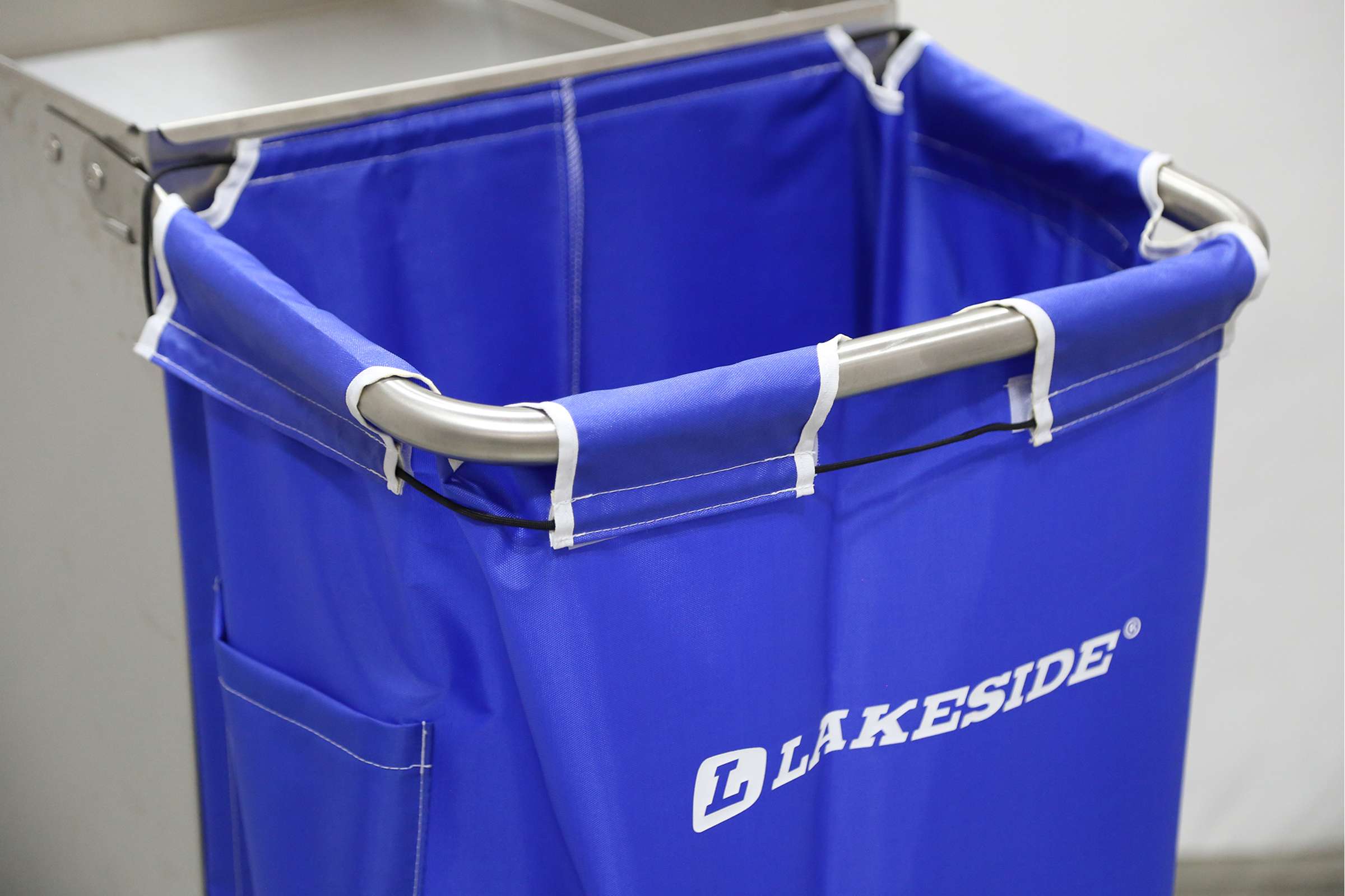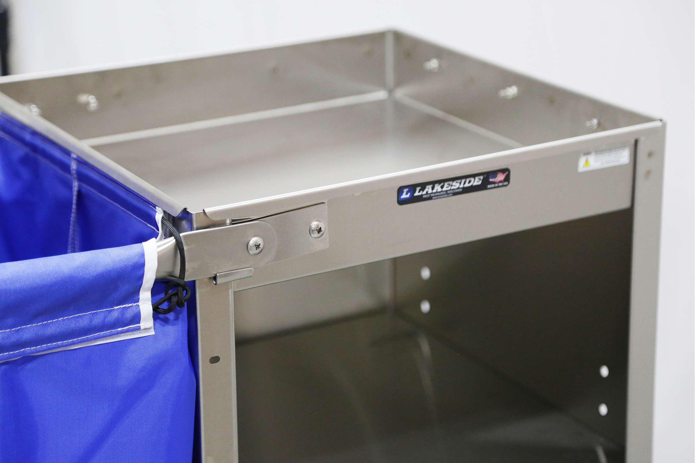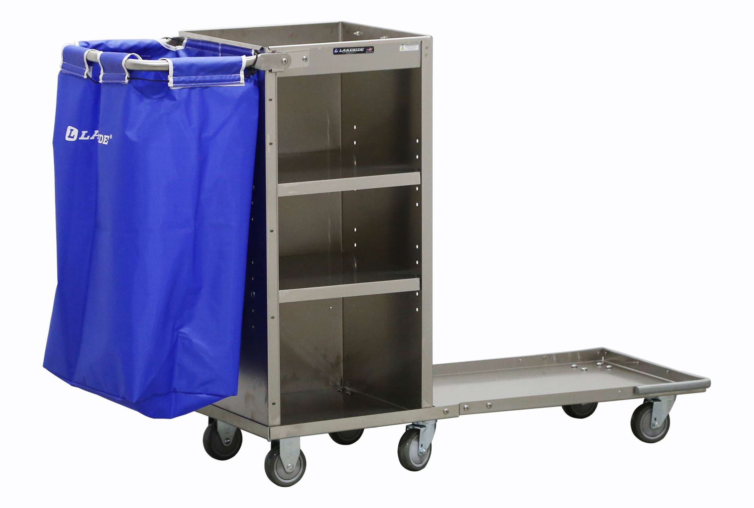 Housekeeping Carts by Lakeside Manufacturing are versatile and efficient designed to assist housekeeping staff in transporting cleaning supplies. The Lakeside 58070 Fold-Up Platform Housekeeping Cart with (1) fold-up platform measuring 18" x 48" has a (2) bucket capacity. Its double bucket design allows for efficient separation and organization of cleaning solutions, reducing cross-contamination and improving overall cleanliness. This Lakeside cart's fold-up platform allows for compact storage, saving valuable space when not in use. This cart's all-welded stainless steel construction with a satin finish ensures durability and longevity, withstanding the rigors of daily use. This housekeeping cart's blue nylon laundry bag for convenient collection and transport of dirty linens, streamlining the housekeeping process. Its supply compartment with adjustable shelves offer ample storage space for cleaning tools, amenities, and other essentials. This cart's 3" deep recessed tray allows for secure storage of cleaning supplies while keeping them easily accessible. Its handle and platform fold up to store cart in 18" x 31" (457 x 787) area. This cart's special locking device holds the platform securely in upright folded position during storage. Equipped with 4 ea. 4" no-mark swivel casters, 2 ea. fixed that allow cart to smoothly maneuver around tight spaces and uneven surfaces. Complies with OSHA and OBRA standards. Customize your design with Lakeside cart experts. Superior lead times. Made in the USA.
