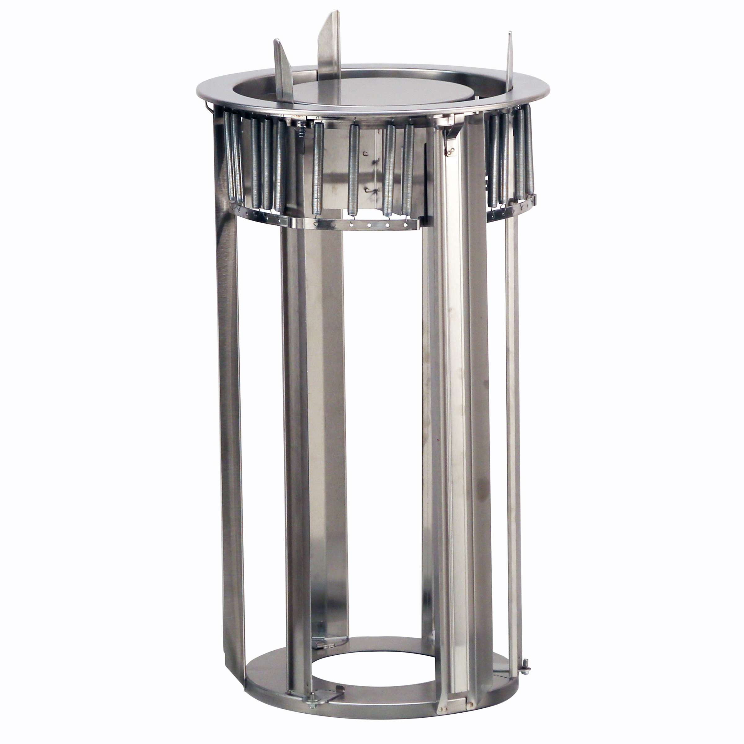 Product Specification: Unit shall be of welded stainless steel construction. Dispensers shall hang from surface opening by an 18-gauge flange ring and feature three each 22-gauge vertical side supports welded to 20-gauge bottom plate. Overall height from flange ring to base of 25” to allow for fit into ADA height-compliant counters. Self-leveling dish carriage shall be of welded stainless steel construction and shall travel vertically in dispenser tube with 3 sets of nylon roller guides for smooth operation. Carriage shall have 22-gauge removable dish platform. Unit shall feature flange mounted perimeter extension springs, which are detachable from the dish carriage to provide adjustment without tools for different weight dishes. Unit shall also feature three stainless steel dish guides running the entire height of the dispenser. Dish guides shall pivot to provide diameter adjustability of 3-1/4” (83mm) without tools or removing components to accommodate various diameter dishes. Unit shall have a vertical plate stacking capacity of 22” (559 mm). Unit shall be NSF and UL listed.