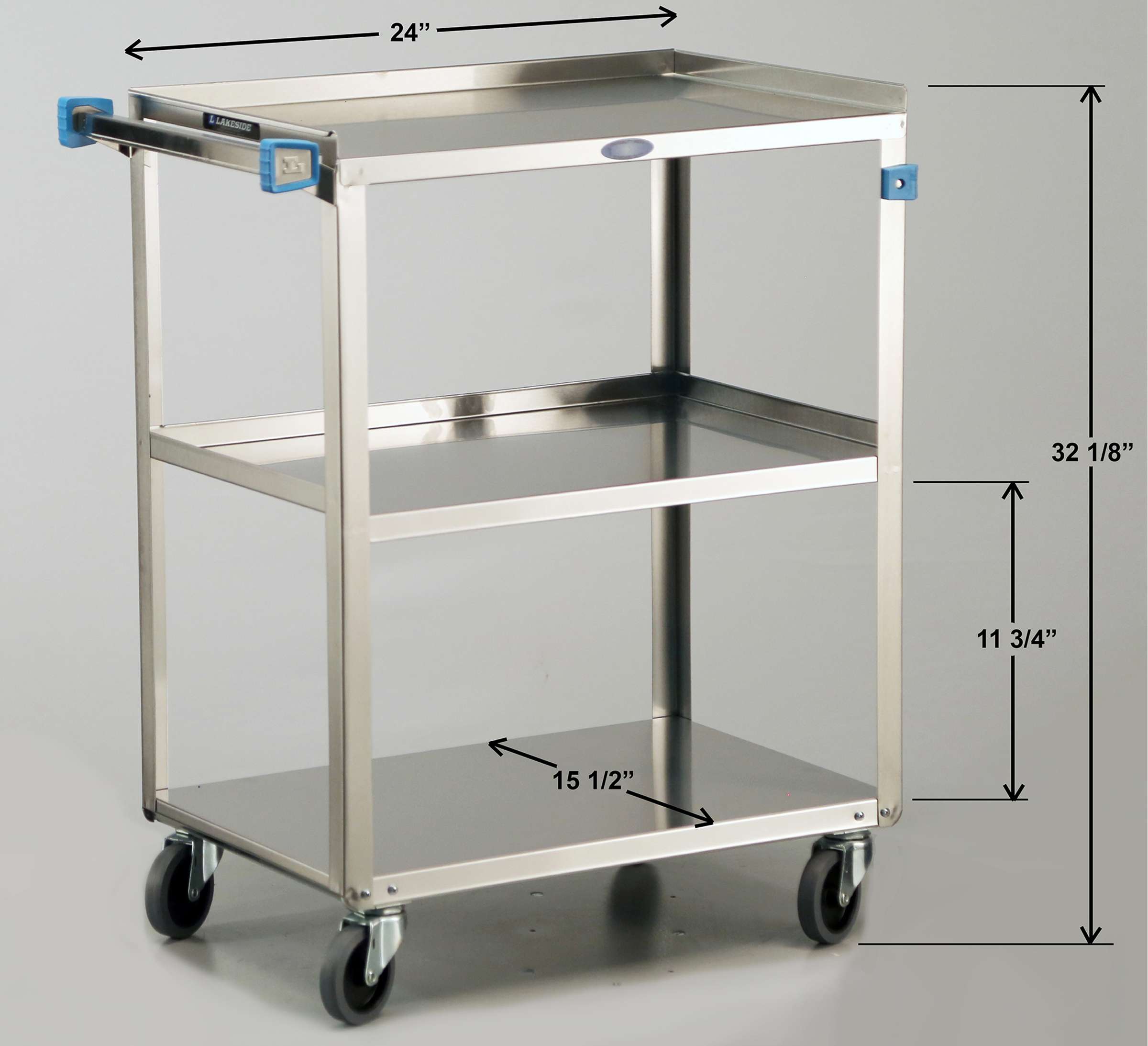 Stainless Steel Utility Carts by Lakeside Manufacturing are ideal for dining area bussing, set-up, tray or soiled dish station, light duty transport and storage. The Lakeside 311 Stainless Steel Utility Cart with (3) shelves measuring 15-1/2" x 24" has a 300-Lb. weight capacity. This cart's bumpers on its legs and handles help protect walls and furniture, while its all-welded angle leg design provides durability. This utility cart's sound deadening material under its shelves restricts vibration and reduces noise. This foodservice cart on wheels has a reinforced, hemmed front that adds strength where the cart is most vulnerable to stress. Its stainless steel construction is easy to clean and sanitize. Unitized electronic welding is used to fasten the 311's shelves and handle to the frame. Endless variations and feature combination. Industry leading ship times from Lakeside's U.S. factory. Proudly made in the USA!