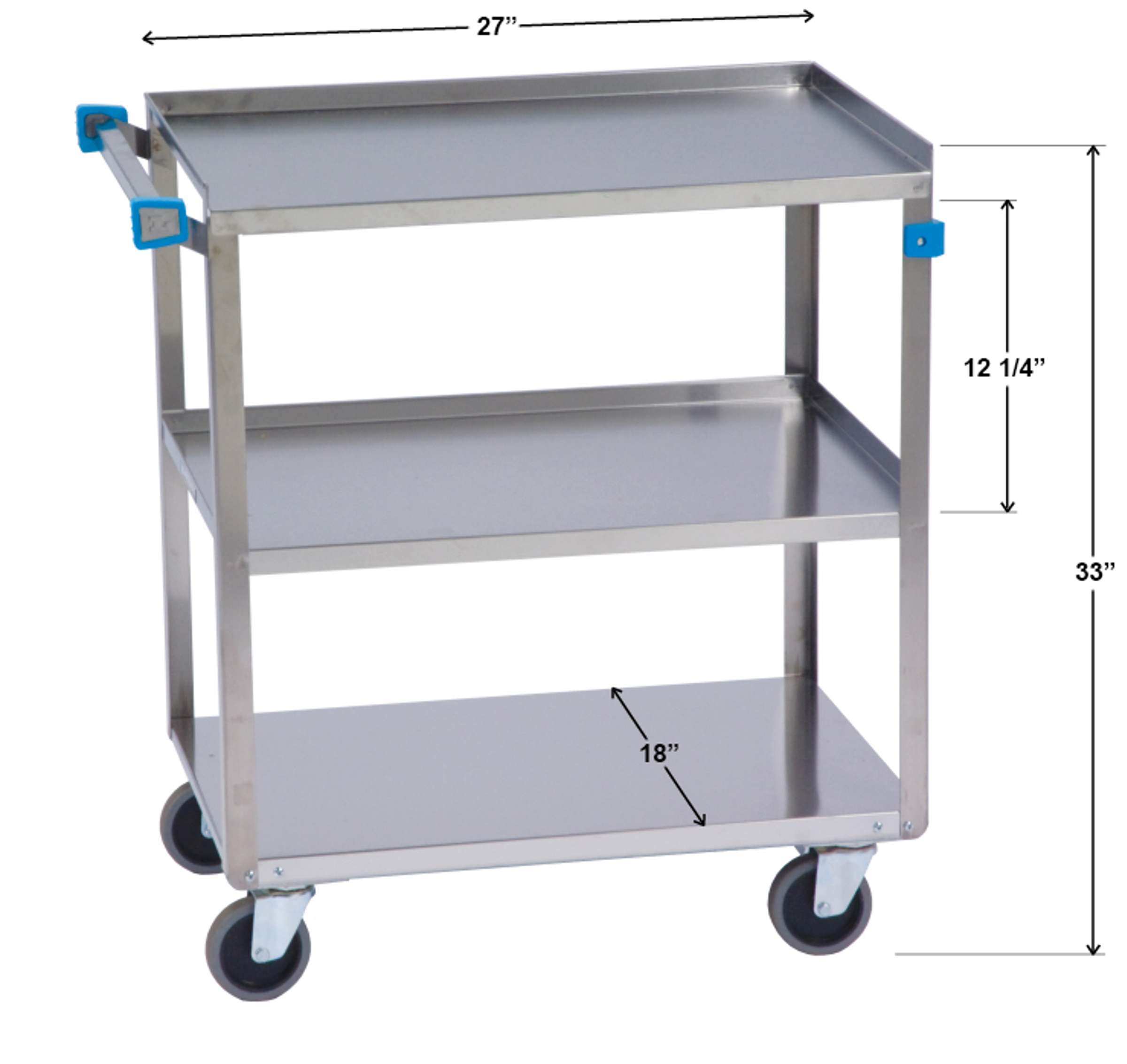 Product Specification: Unit shall be Lakeside Model 322 and shall have stainless steel unitized electronic welding to fasten shelves and handle to frame with a weight capacity of 300-Lb. (136 kg). This cart shall have 3 ea. open shelves measuring 18" x 27" and be constructed of 22-gauge stainless steel. Shelves shall have 12-1/4" clearance and be reinforced with a hemmed front. All-welded angle legs shall be constructed of 20-gauge stainless steel. Unit shall have a stainless steel push handle welded to frame, and shall have corner bumpers mounted to front legs and ends of push handle. Unit shall have an independent galvanized steel dolly frame fastened to the bottom with 8 screws. Bottom corners shall be rounded. Four each 3-1/2" double race, double-ball bearing swivel casters shall be mounted to the dolly frame. Unit shall be listed as light duty. Made in USA.