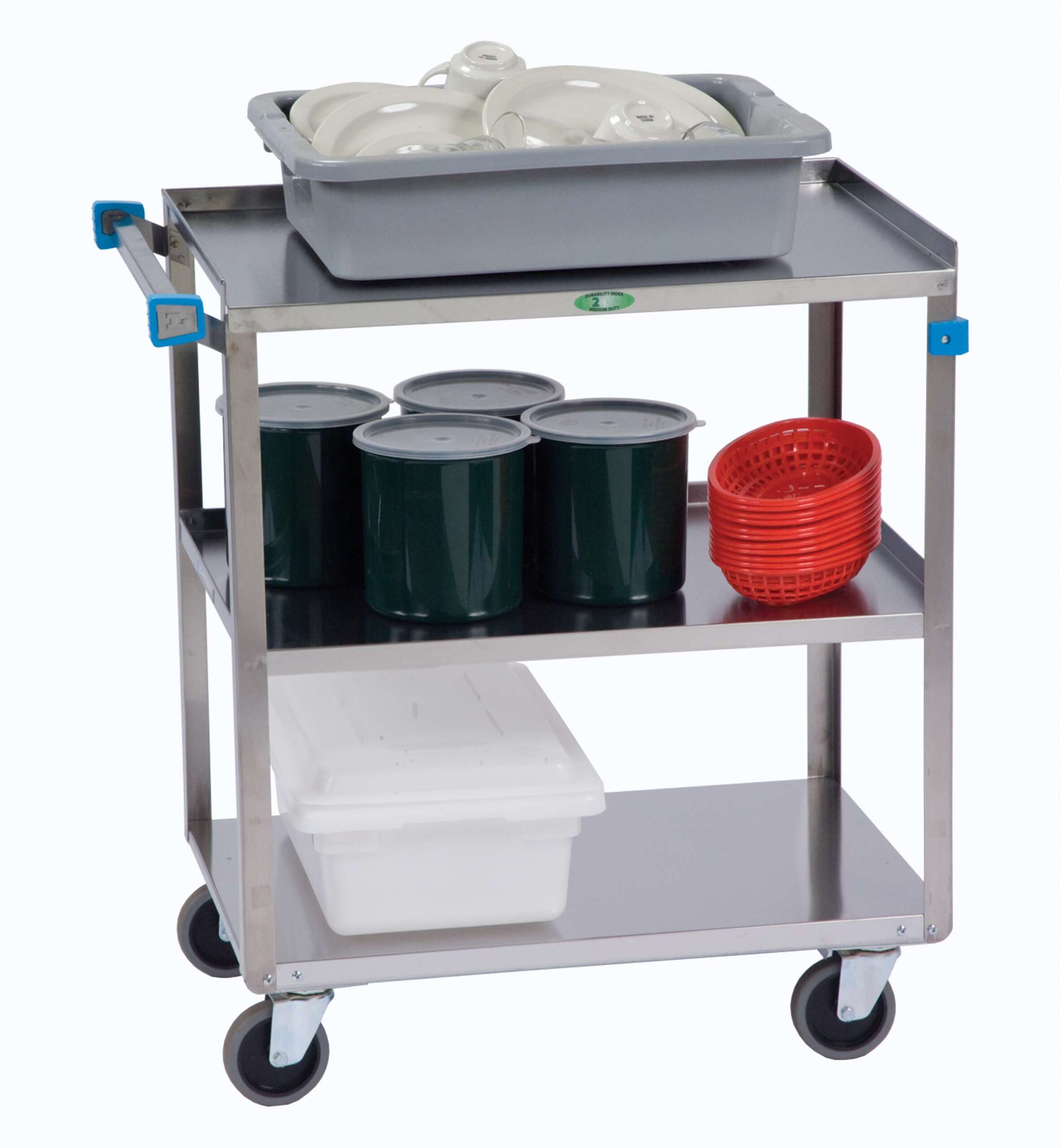 Stainless Steel Utility Carts by Lakeside Manufacturing are ideal for dining area bussing, set-up, tray or soiled dish station, medium duty transport and storage. The Lakeside 422 Stainless Steel Utility Cart with (3) shelves measuring 18" x 27" has a 500-Lb. weight capacity. This utility cart's all-welded angle leg design provides durability, while its reinforced, hemmed front adds strength where the cart is most vulnerable to stress. The 422's sound deadening material under its shelves restricts vibration and reduces noise, while its stainless steel construction is easy to clean and sanitize. This foodservice utility cart has bumpers on its legs and handles to protect walls and furniture. The 422 is constructed of a durable, unitized electronically welded angle leg frame. Endless variations and feature combination. Industry leading ship times from Lakeside's U.S. factory. Proudly made in the USA!