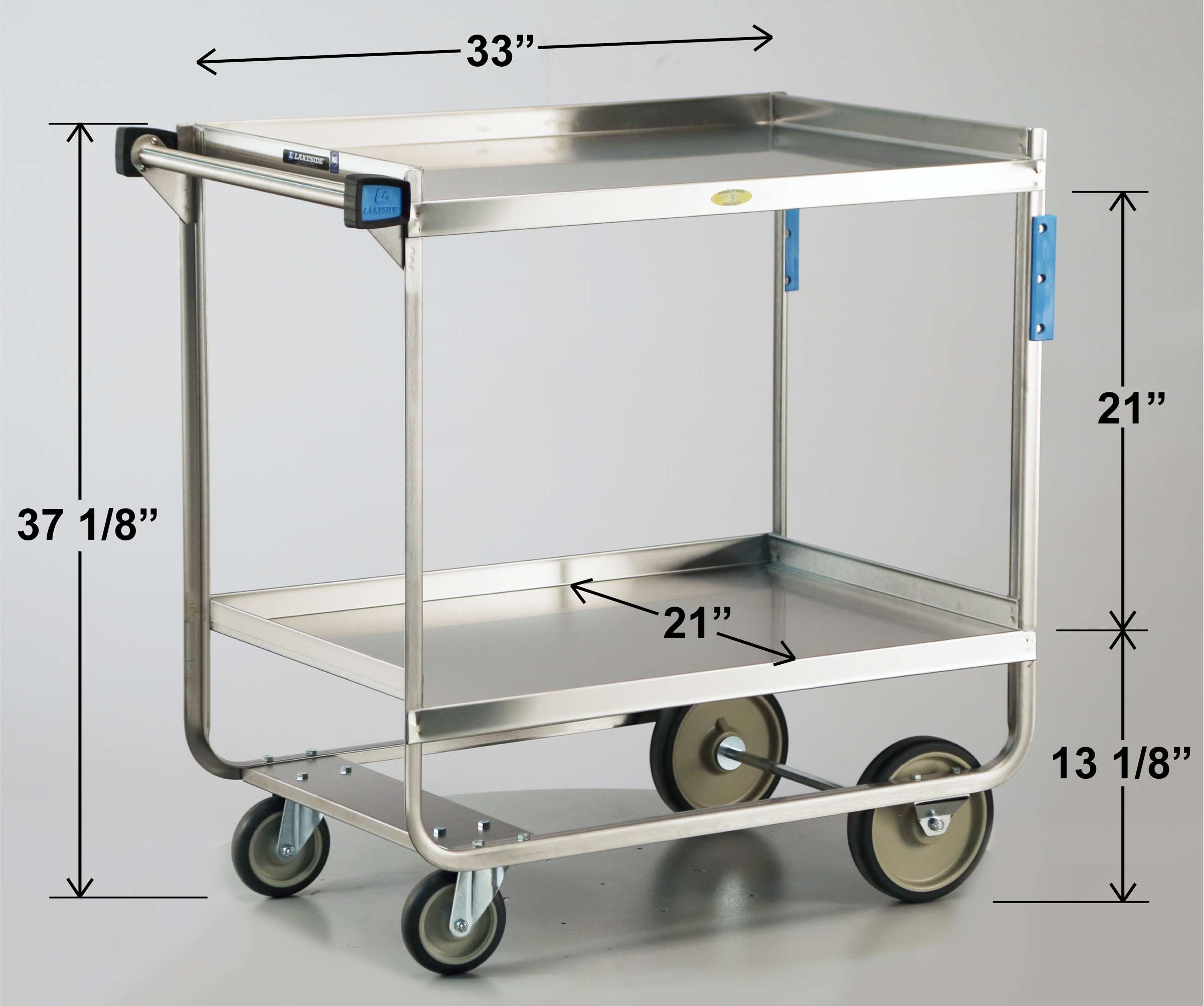 Stainless Steel Utility Carts by Lakeside Manufacturing are ideal for dining area bussing, set-up, tray or soiled dish station, heavy-duty transport, and storage. The Lakeside 543 Stainless Steel Utility Cart with (2) shelves measuring 21" x 33" has a 700-Lb. weight capacity. This utility cart's larger 8” (203) front wheels allow cart to transition over uneven surfaces with ease. Its fixed front wheels help guide cart in a straight line, while making it easier to navigate corners. The 543's angled “U”-shaped frame design provides superior structural strength for larger loads. This foodservice cart has an all-welded construction for a stronger structure and easier to clean surface. Its no-mark, extra load, cushion tread wheels absorb impact, reducing vibration and strain. This utility cart's stainless steel construction is easy to clean and sanitize. Its bumpers on legs and handles protect walls and furniture. This model is NSF listed. Lakeside is proudly made in the USA with industry leading ship times. Customize your design with Lakeside cart experts now! Made in the USA.