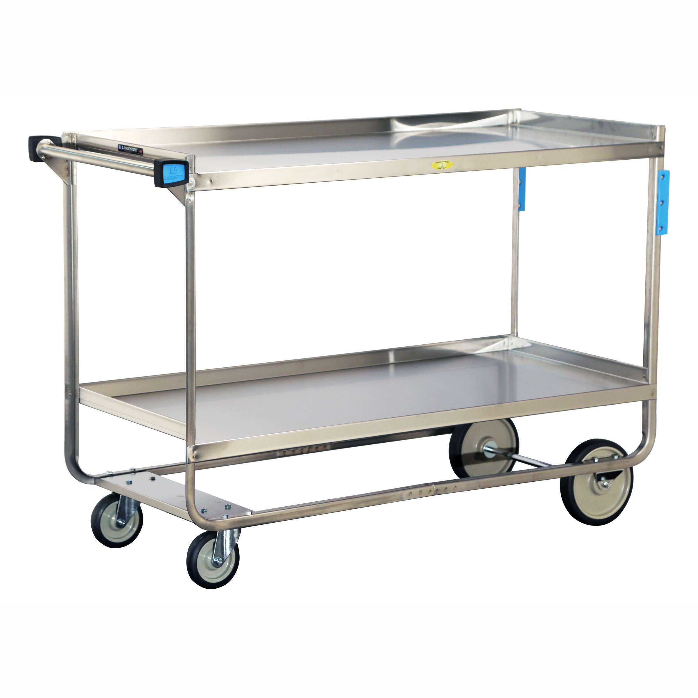 Stainless Steel Utility Carts by Lakeside Manufacturing are ideal for dining area bussing, set-up, tray or soiled dish station, heavy-duty transport, and storage. The Lakeside 558 Stainless Steel Utility Cart with (2) shelves measuring 21" x 49" has a 700-Lb. weight capacity. This utility cart's larger 8” (203) front wheels allow cart to transition over uneven surfaces with ease. Its fixed front wheels help guide cart in a straight line, while making it easier to navigate corners. The 558's angled “U”-shaped frame design provides superior structural strength for larger loads. This foodservice cart has an all-welded construction for a stronger structure and easier to clean surface. Its no-mark, extra load, cushion tread wheels absorb impact, reducing vibration and strain. This utility cart's stainless steel construction is easy to clean and sanitize. Its bumpers on legs and handles protect walls and furniture. This model is NSF listed. Lakeside is proudly made in the USA with industry leading ship times. Customize your design with Lakeside cart experts now! Made in the USA.