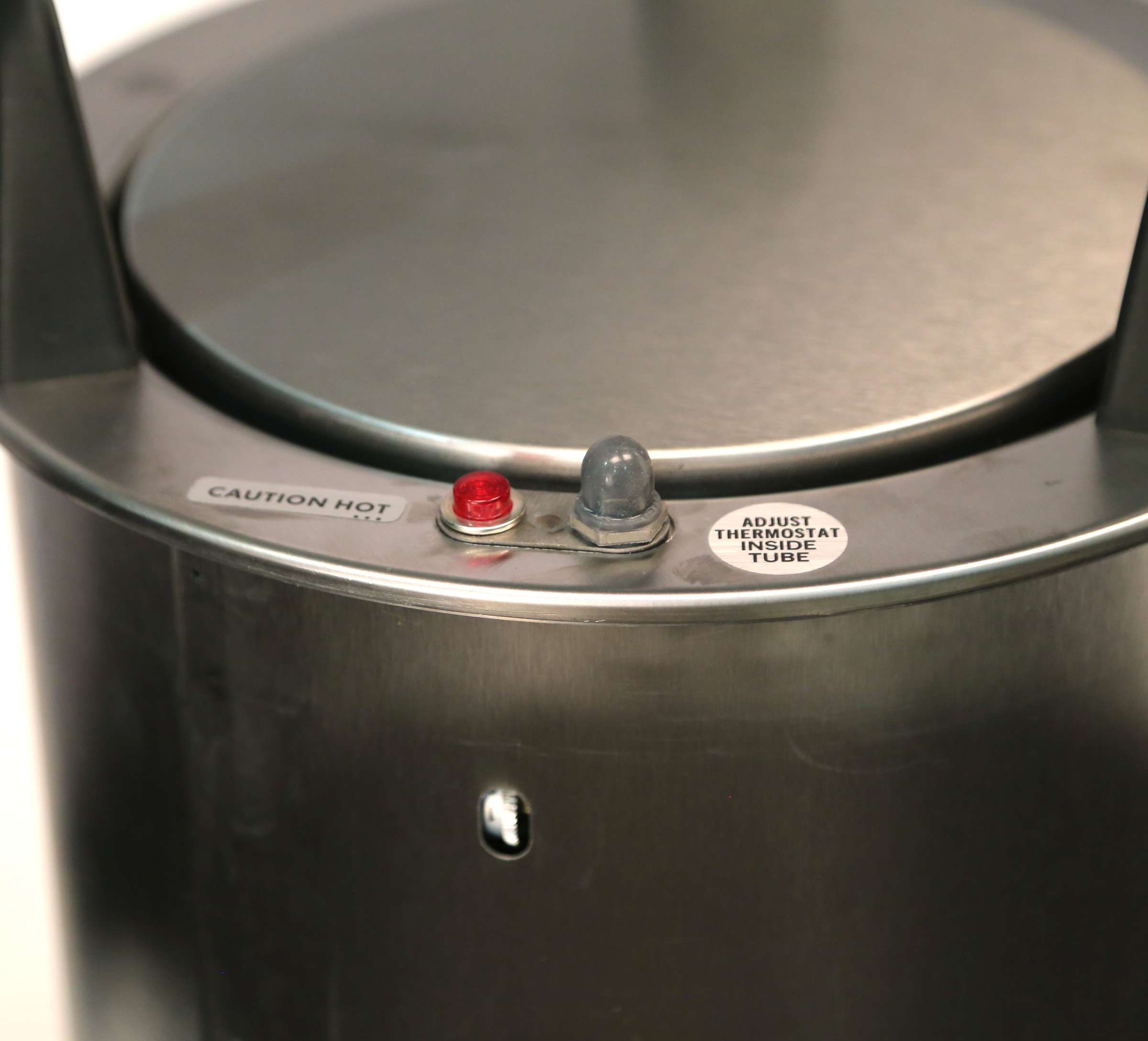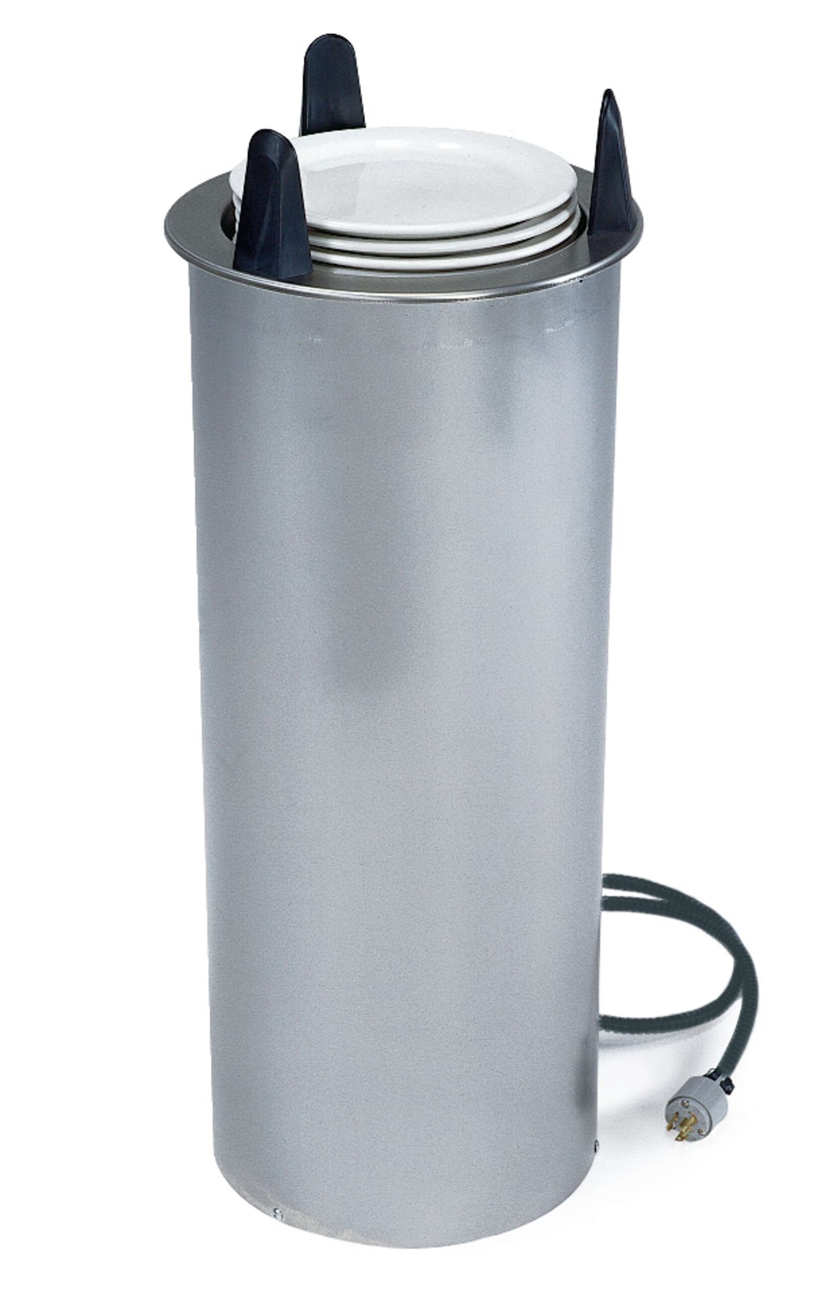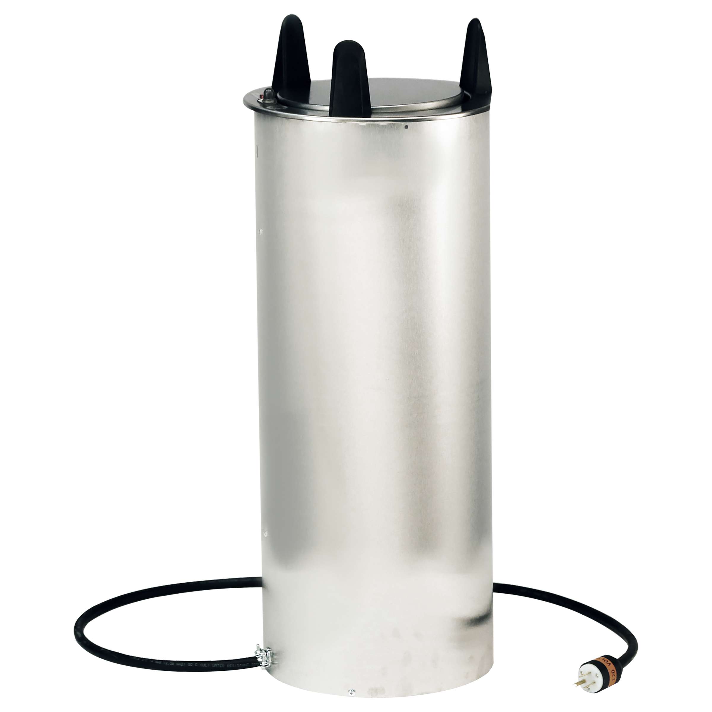 Heated Models Only: Unit shall be 120 VAC 60 Hz and shall have 5´ (1524 mm) power supply cable with L15-5P NEMA twist lock plug for 120 VAC. Dispenser tubes shall be fully enclosed in 22-gauge stainless steel, and have a circular bottom mounted 300 or 450 watt heater element to provide convection heat. Heating system shall feature thermostatic control in a tamper protective location with safe high-end shut-off. Control shall have Infinite settings between low and high temperature cutouts. Thermostat shall be field adjustable for average interior air temperature between 100° F (38°C) and 180° F (82° C) at middle adjustable thermostatic setting. On-off switch and power indicator light shall be mounted on top flange of dispenser. Average dish temperature rise of 40° F (22° C) above ambient shall be achieved within one hour of initial heating cycle at middle adjustable thermostatic setting. Unit shall be UL listed.