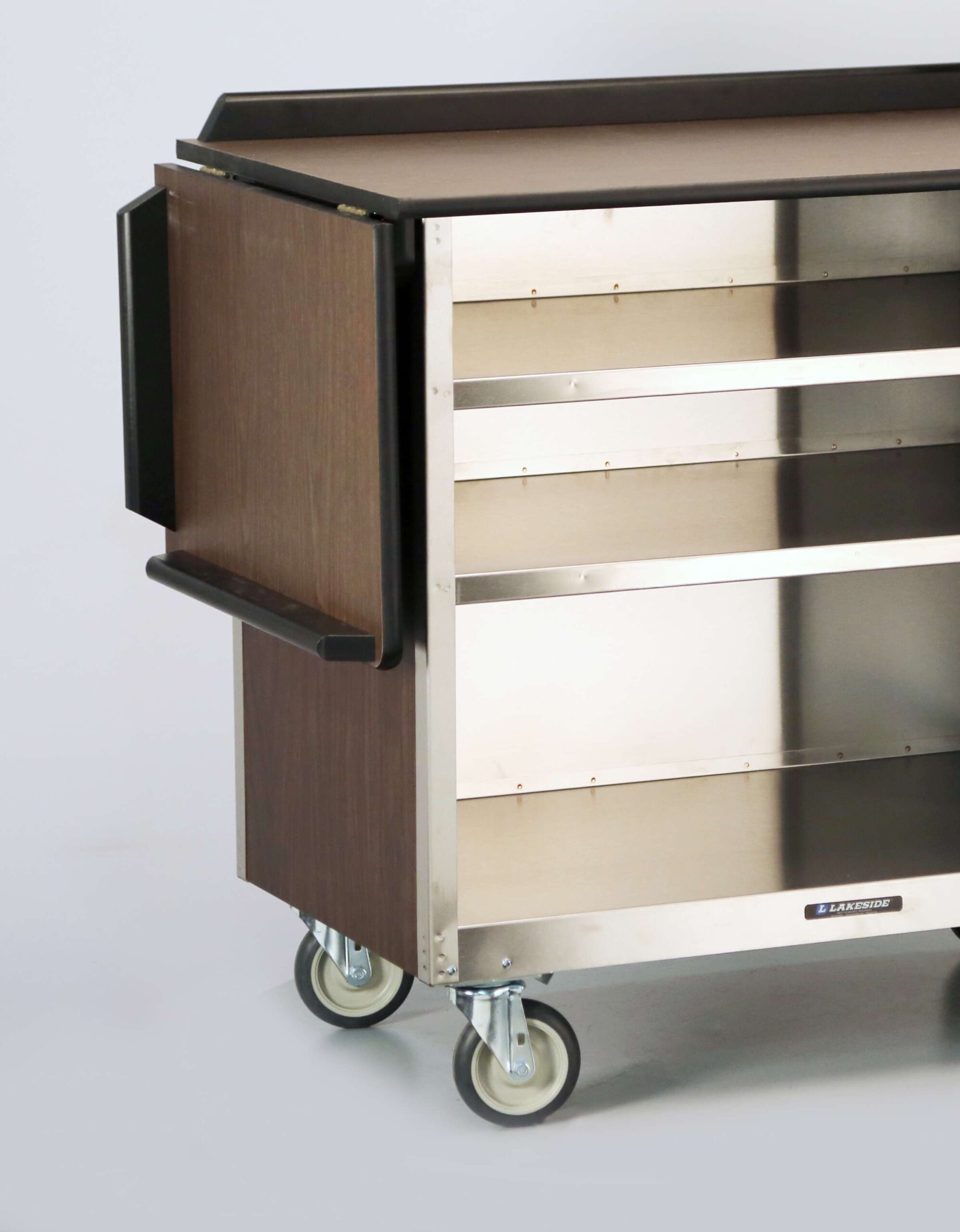 Beverage Service Carts by Lakeside Manufacturing eliminate the need for serving tables with smooth transporting and serving functionalities. The Lakeside 676 Beverage Service Cart with (3) 21" x 50" interior shelves has (2) drop leaves that create a spacious 22-1/2" x 93-1/4" top for coffee urns, snack trays and more. These drop leaves fold down when serving in tight areas or for compact storage. This beverage cart has 2" high protective edge on top 3 sides prevents items from falling or slipping. This cart's three interior shelves provide convenient storage of back-up items and supplies, while its Stainless steel shelves and interior are durable, easy to clean and sanitize. Its durable vinyl exterior is attractive, waterproof, and easy to maintain. Equipped with heavy-duty 5" or 4" diameter all-swivel casters for easy maneuverability. Optional contour top adds contemporary flair to décor. Choice of laminate and vinyl exterior finishes. Available in three sizes, with or without spacious dropleaves. Comes standard in walnut. Customize your design with Lakeside cart experts. Superior lead times. Made in the USA.