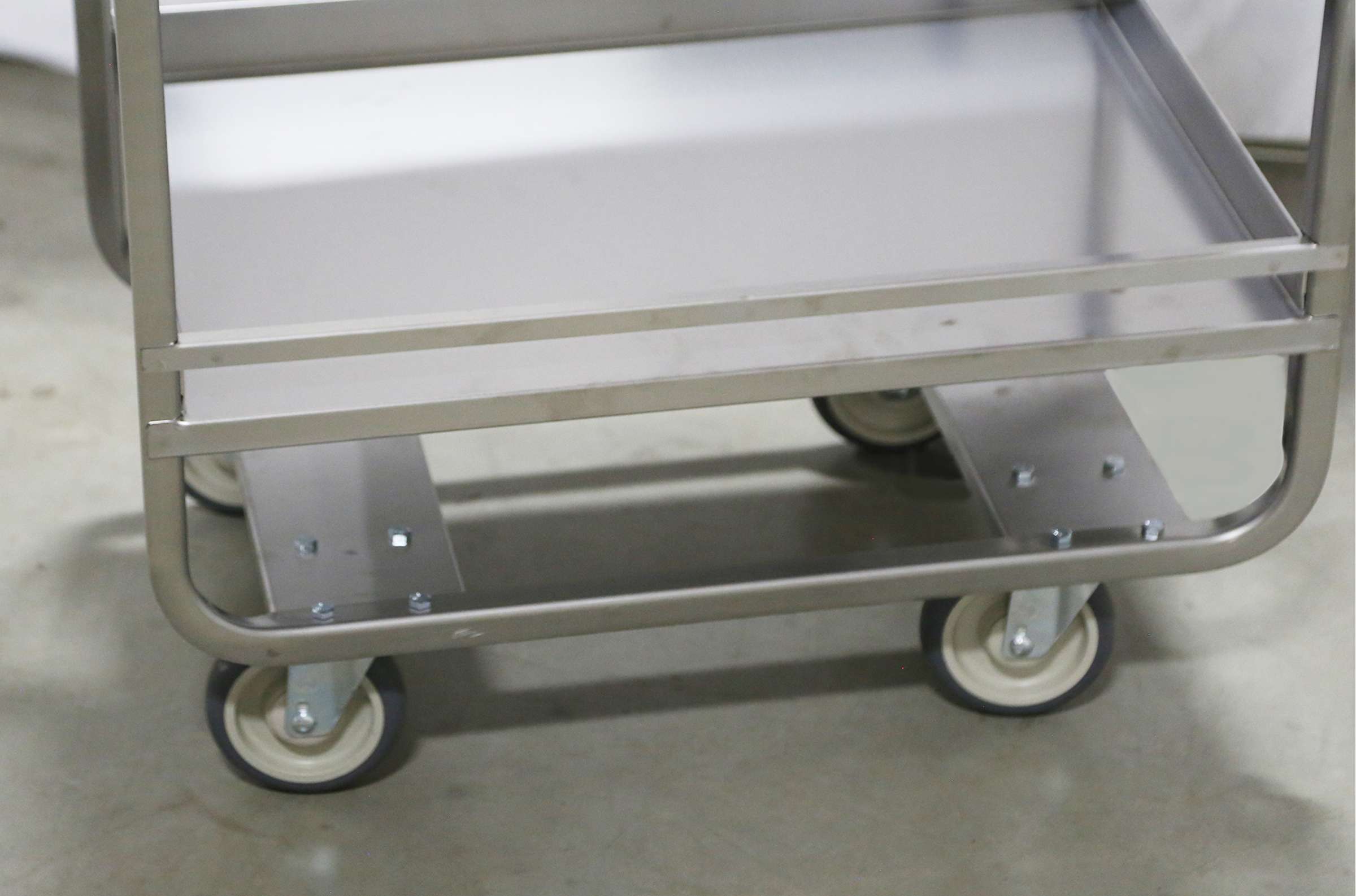 Product Specification: Unit shall be Lakeside Model 726 and shall have stainless steel resistance spot welding to fasten shelves, guard rail and handle to frame with a weight capacity of 700-Lb. (136 kg). This cart shall have 3 ea. open shelves measuring 18" x 27" and be constructed of 18-gauge stainless steel. Shelves shall have 9" clearance and be reinforced with a hemmed front. Shelves shall have guard rail on open edge of top and middle shelf, and on all 4 sides of bottom shelf. Guard rail shall be constructed of 16-gauge stainless steel. All-welded angle legs shall be constructed of 11-gauge stainless steel. Unit shall have a stainless steel tubular handle welded to frame, and shall have corner bumpers mounted to front legs and ends of push handle. Bottom corners shall be rounded. Four each 5" double race, double-ball bearing swivel casters shall be mounted to the dolly frame. Unit shall be listed as heavy-duty. Made in USA.