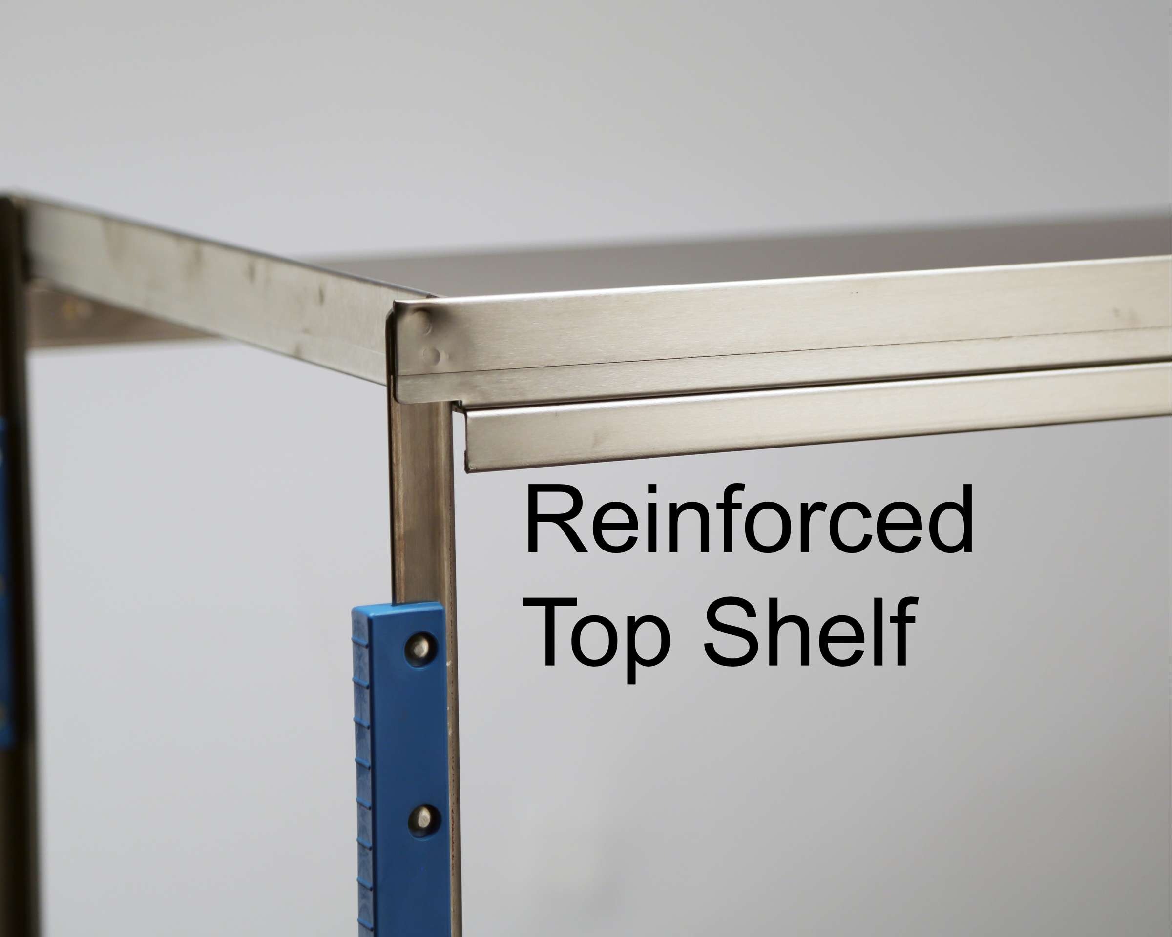 Product Specification: Unit shall be of fully welded stainless steel construction. Legs and frame shall be of U-frame design, eliminating the need for corner reinforcements. Leg frames shall be 11-gauge angle stainless steel. Shelves shall be of 18-gauge stainless steel and shall be welded to vertical leg frames. Shelves shall be double hemmed on all four edges for extra rigidity. Unit shall have two each 5" (127 mm) diameter extra-load swivel casters with 1-1/4" (32 mm) wide non-marking polyurethane wheels, and two each 8" diameter extra-load wheels mounted to a fixed axle. Swivel casters shall be plate type and shall be bolted to an 18-gauge 5" (127 mm) wide stainless steel cross member with a galvanized reinforcement. Unit shall have push handle made of 18 gauge 1" O.D. stainless steel tubing. Handle mounting brackets shall be welded to vertical leg frame. Unit shall have two each bumpers mounted to handle ends and two each 6" (152 mm) vertical bumpers riveted to front legs.