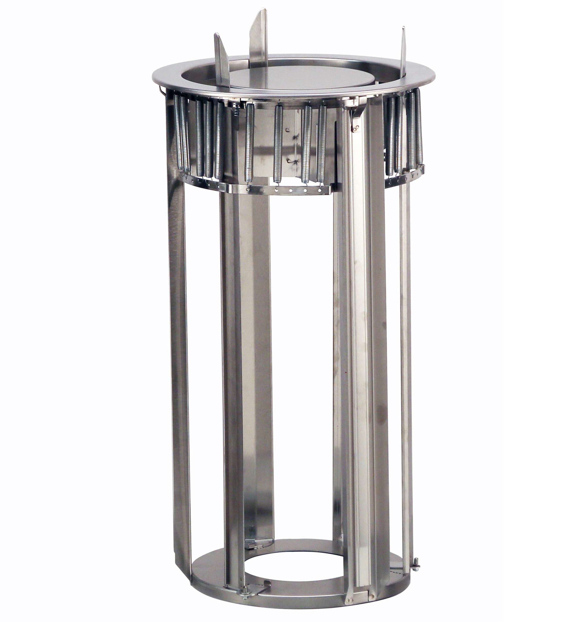 Product Specification: Unit shall be of welded stainless steel construction. Dispensers shall hang from surface opening by an 18-gauge flange ring and feature three each 22-gauge vertical side supports welded to 20-gauge bottom plate. Overall height from flange ring to base of 25” to allow for fit into ADA height-compliant counters. Self-leveling dish carriage shall be of welded stainless steel construction and shall travel vertically in dispenser tube with 3 sets of nylon roller guides for smooth operation. Carriage shall have 22-gauge removable dish platform. Unit shall feature flange mounted perimeter extension springs, which are detachable from the dish carriage to provide adjustment without tools for different weight dishes. Unit shall also feature three stainless steel dish guides running the entire height of the dispenser. Dish guides shall pivot to provide diameter adjustability of 3-1/4” (83mm) without tools or removing components to accommodate various diameter dishes. Unit shall have a vertical plate stacking capacity of 22” (559 mm). Unit shall be NSF and UL listed.