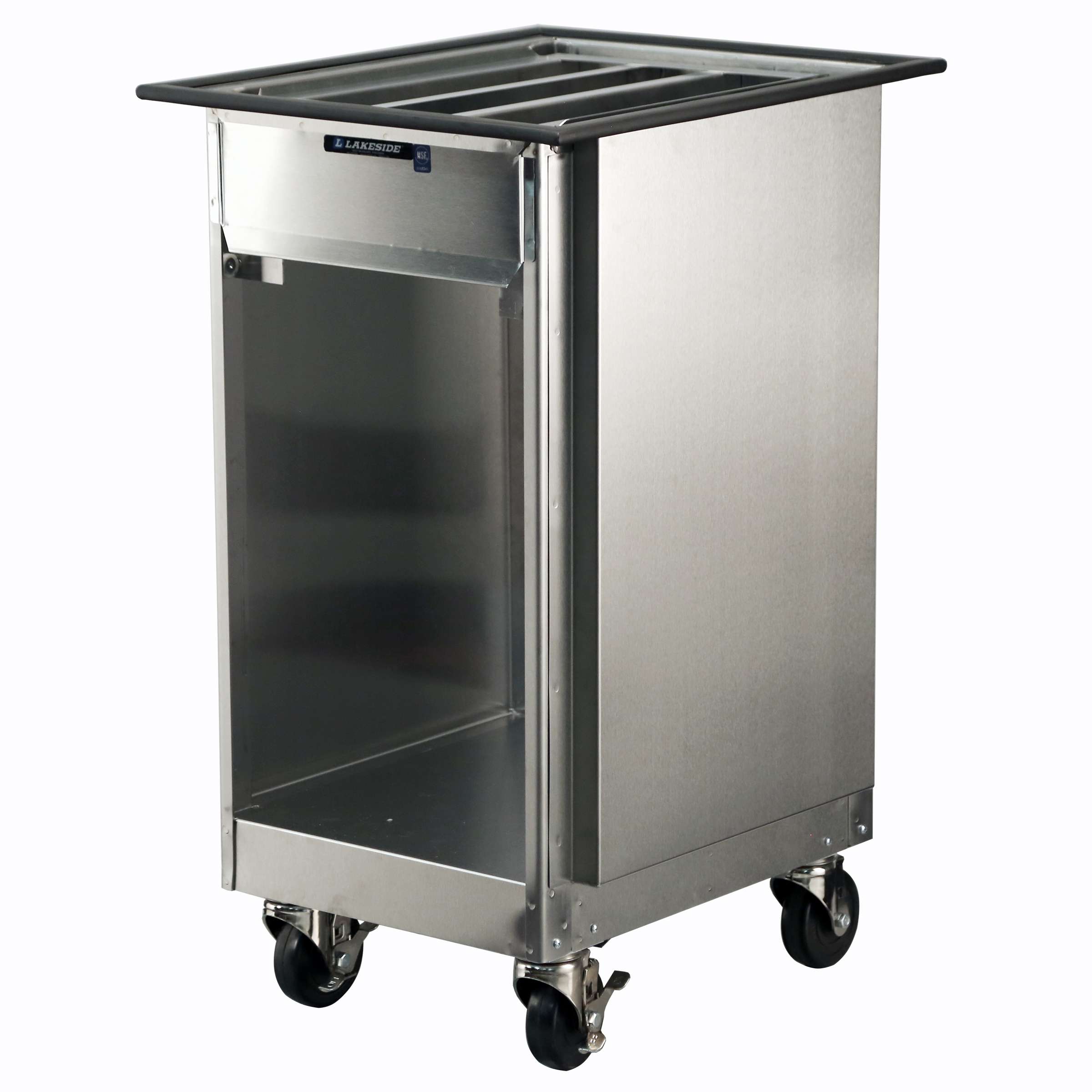 Mobile dispensers allow quick transporting and refilling so your customers can readily access trays. The Lakeside 996 Mobile Tray Dispenser has open sides with a silverware dispenser is NSF and fits 14 x 18-in. or 15 x 20-in. trays with a 150-tray capacity. Adjusting the height level is easy and convenient. Simply detach and attach springs as needed with no tools required. The handy platform base stores empty trays or racks for added storage. All 4" swivel casters, 2 with brake, allow easy maneuverability. The stainless steel material is easy to clean and sanitize. The stainless steel construction ensures long life and durability. This unit’s perimeter bumper protects walls and furnishings. The 996's half-size tray holds up to (150) 14" x 18" trays. Nobody beats Lakeside’s lead times. Made in the USA.