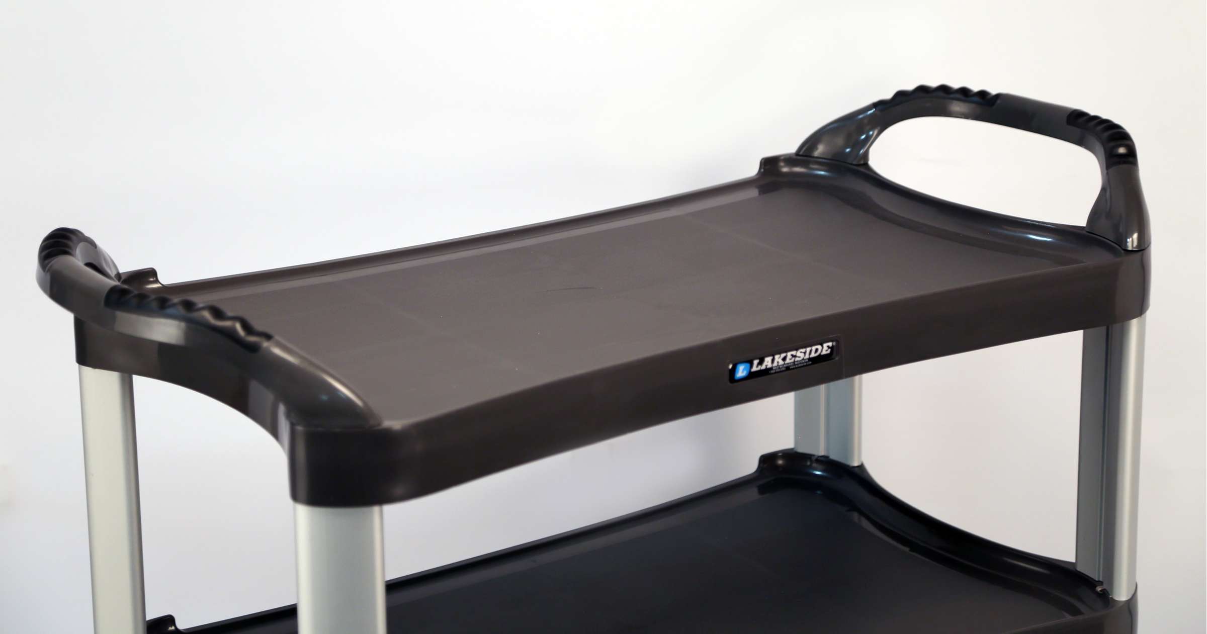 Product Specification: Unit shall be Lakeside model 25___ (10, 12) to have three shelves of reinforced polyethylene with a total load capacity of 500 lb. Shelves shall have attractive inverse contour rounded edges with coved interior corners for easy cleaning. Legs shall be of extruded aluminum with brushed finish. Legs shall easily mount to flanges on shelf corners without hardware. Dual handles shall have ergonomic cushioned grips, and shall snap onto top shelf without tools or hardware. Casters shall be all-swivel corner-mount stem type, with 4” diameter clear non-marking polyurethane wheels. Casters shall snap into shelf bottom receptacle without hardware.