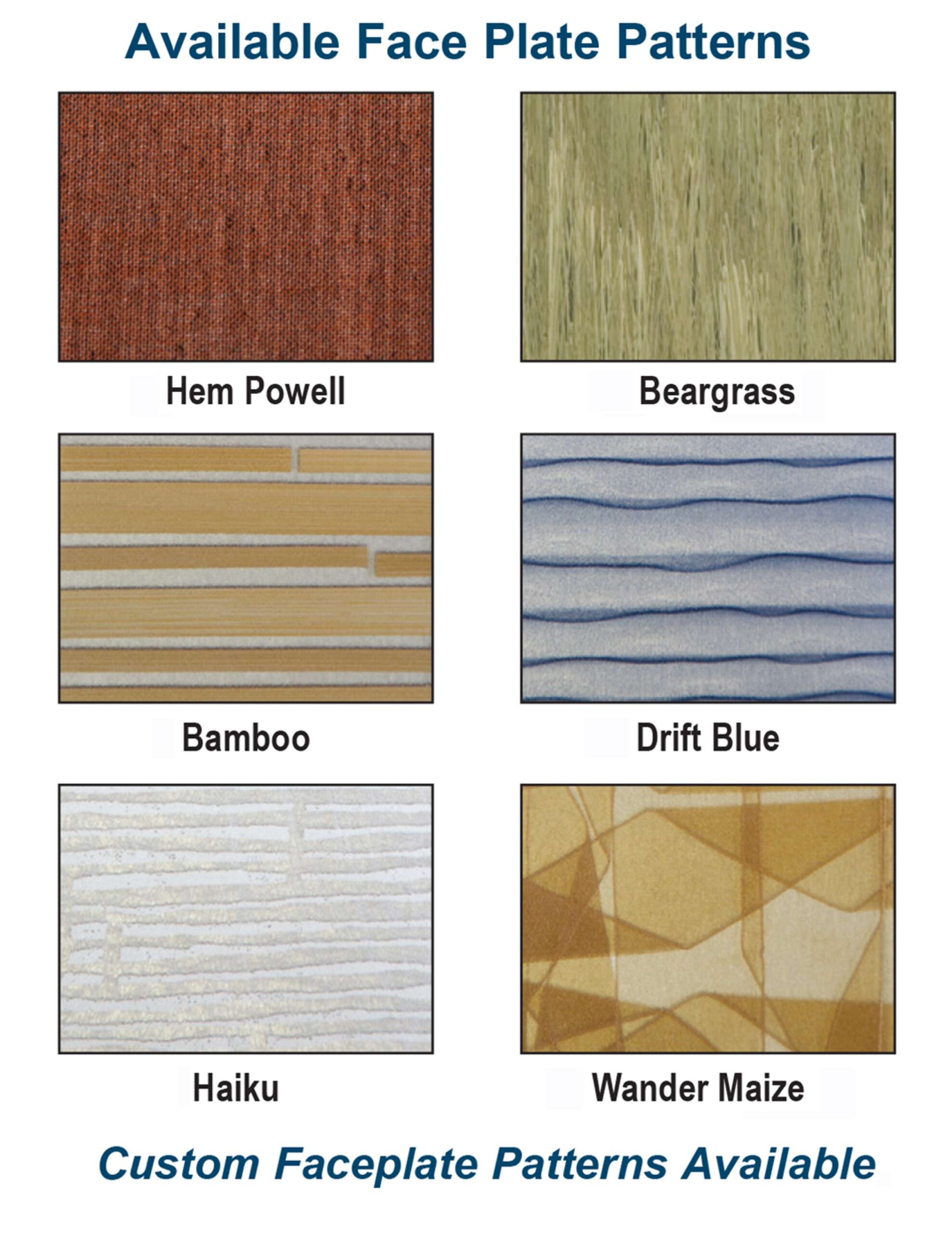 - This model is shown with Beargrass acrylic faceplate. Additional faceplate designs (Hem Powell, Bamboo, Drift Blue, Haiku and Wander Maize) available upon request.