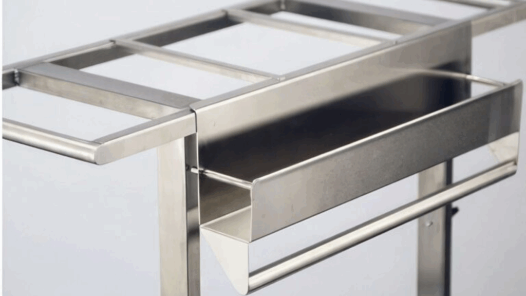 The stainless steel top accommodates a full-size pan, smaller pans with inserts, or an optional cutting board for versatile prep. Integrated handles on each end hold extra pans, and a detachable speed rail with towel bar keeps spices, sauces, and bottles close at hand.