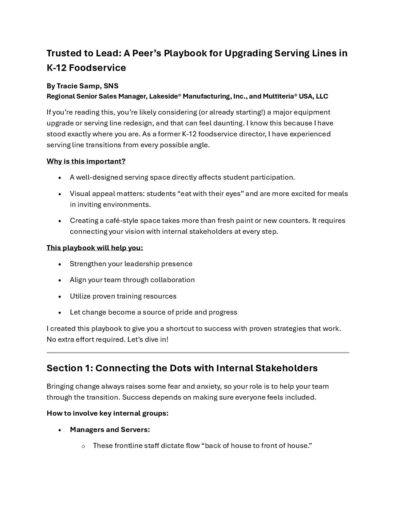 Your serving line is more than just a place to serve meals—it’s the heartbeat of your foodservice program. But what happens when it’s outdated, inefficient, and holding your team back? Tracie Samp, a former K-12 foodservice director who’s been in your shoes, knows the challenges all too well. In this white paper, Tracie shares the roadmap she wished for during her first renovation.