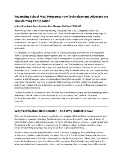 This white paper reveals how technology and advocacy are transforming school meal programs into vibrant, student-centered spaces. By using data to refine menus, empowering students to shape offerings, and creating fast, flexible serving lines, schools are turning cafeterias into destinations students want to stay for. Real stories show how small changes—like a student-driven vegan dish or mirrored serving lines—can reignite participation and excitement.