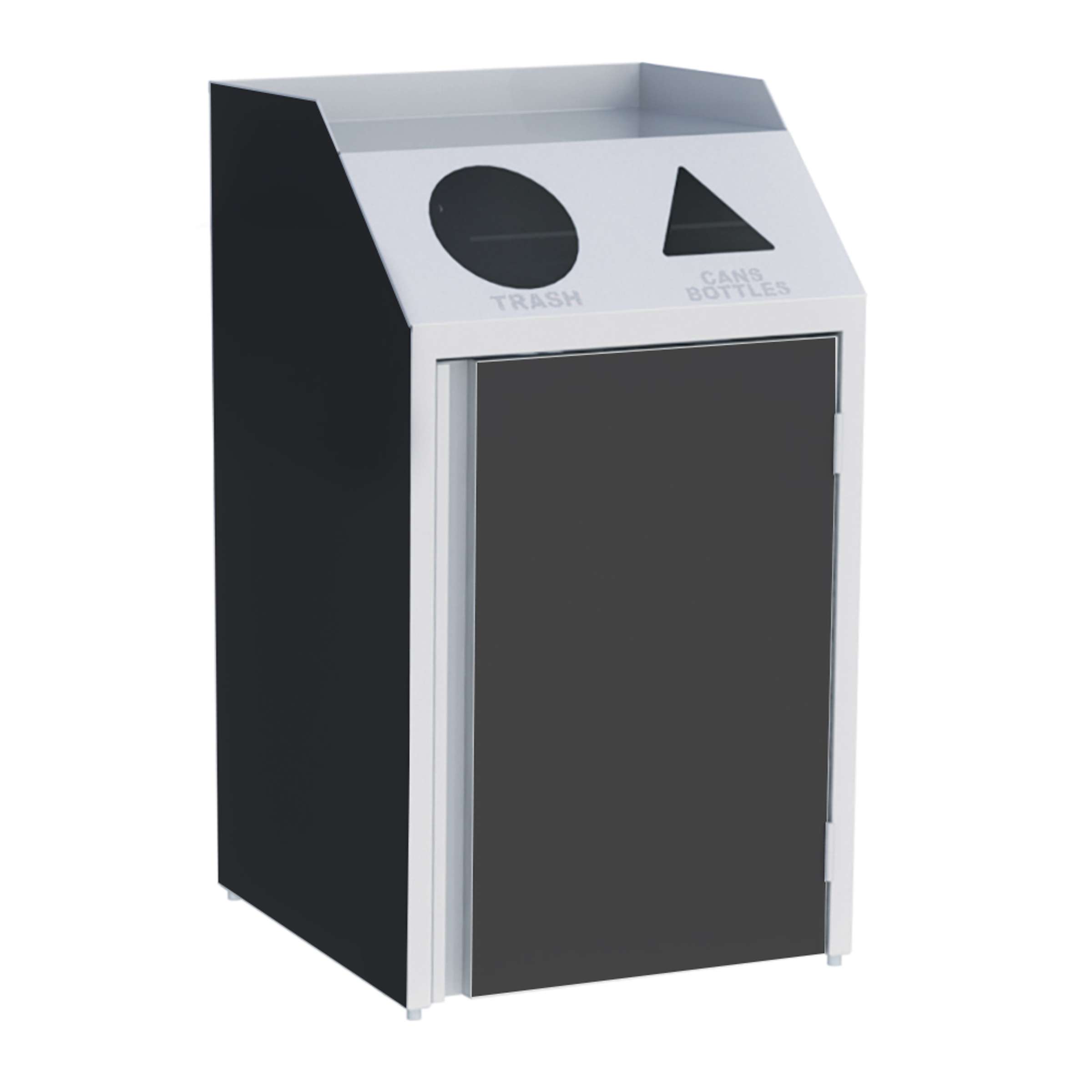Product Specification: Unit shall be of welded stainless steel construction and shall have 20-gauge sides and18-gauge top. Interior compartment floor shall be 18-gauge stainless steel. Units shall have specific chute openings to accept waste/refuse, recyclables (plastic bottles/aluminum cans), paper, or liquids. Chute openings shall have symbols indicating function. Liquid/Cup Refuse units shall feature a refuse chute and include a drop-in stainless steel drainage sink and sealed 7-gallon polyethylene liquid receptacle. Front-access models shall have a 4" high raised edge to accommodate tray storage. Units shall have leveling feet to prevent rocking on uneven floors. Hinged compartment door(s) shall have full-length finger grip and magnetic closure latch.