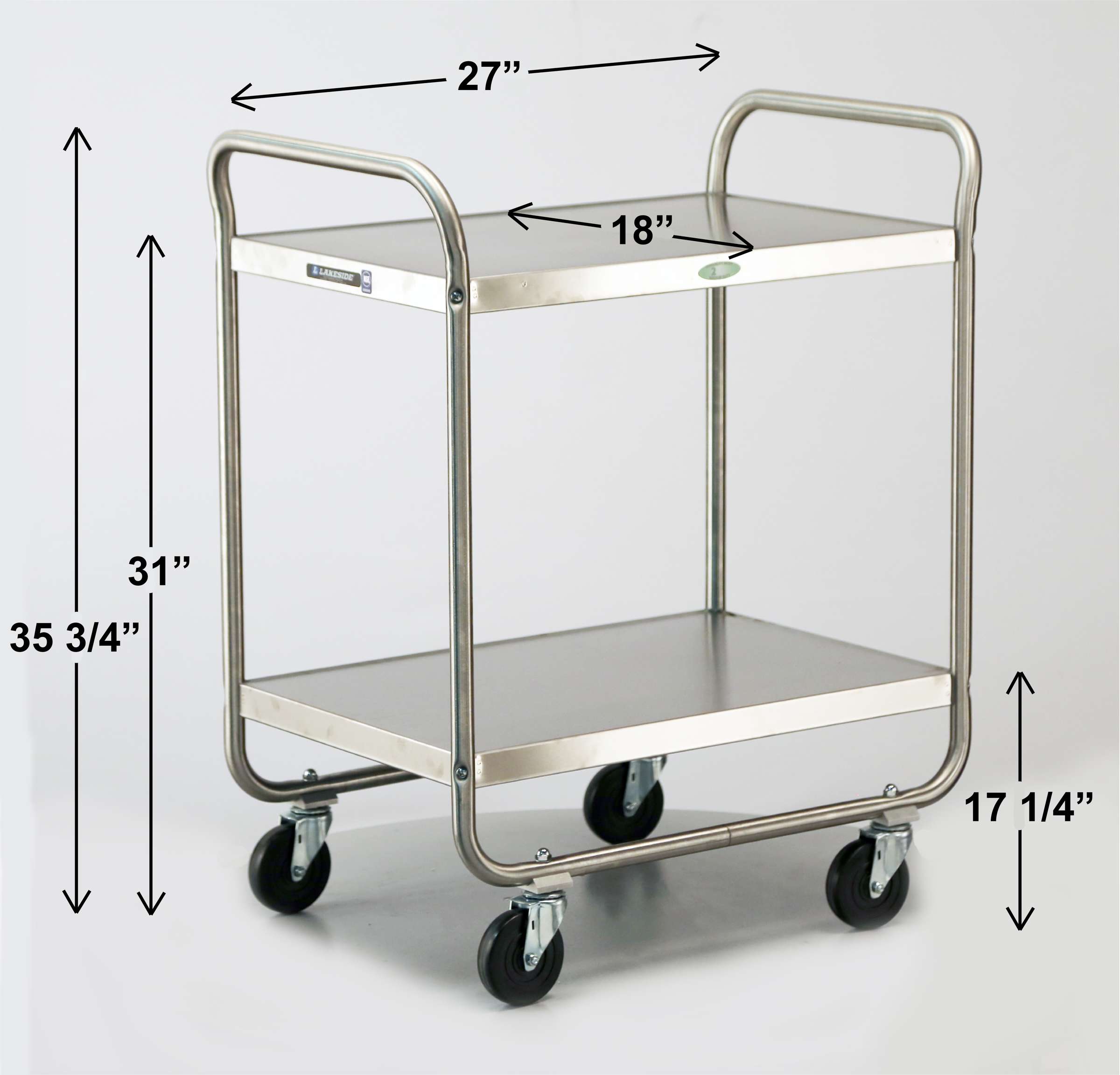 Product Specification: Unit shall be Lakeside Model 221 and shall have stainless steel shelves secured to tubular legs with screw and nut with a weight capacity of 500-Lb. (136 kg). This cart shall have 2 ea. open shelves measuring 18" x 27" and be constructed of 20-gauge stainless steel. Shelves shall have 18-3/4” clearance with reinforced edges. U-frame shall have 18-gauge 1” thick stainless steel round tubing forming integrated push handle on two ends. Bottom corners shall be rounded. Four each 4" swivel stem casters shall be secured through holes on bottom tube with acorn nut. Unit shall be listed as medium duty. Unit shall be NSF listed. Made in USA.