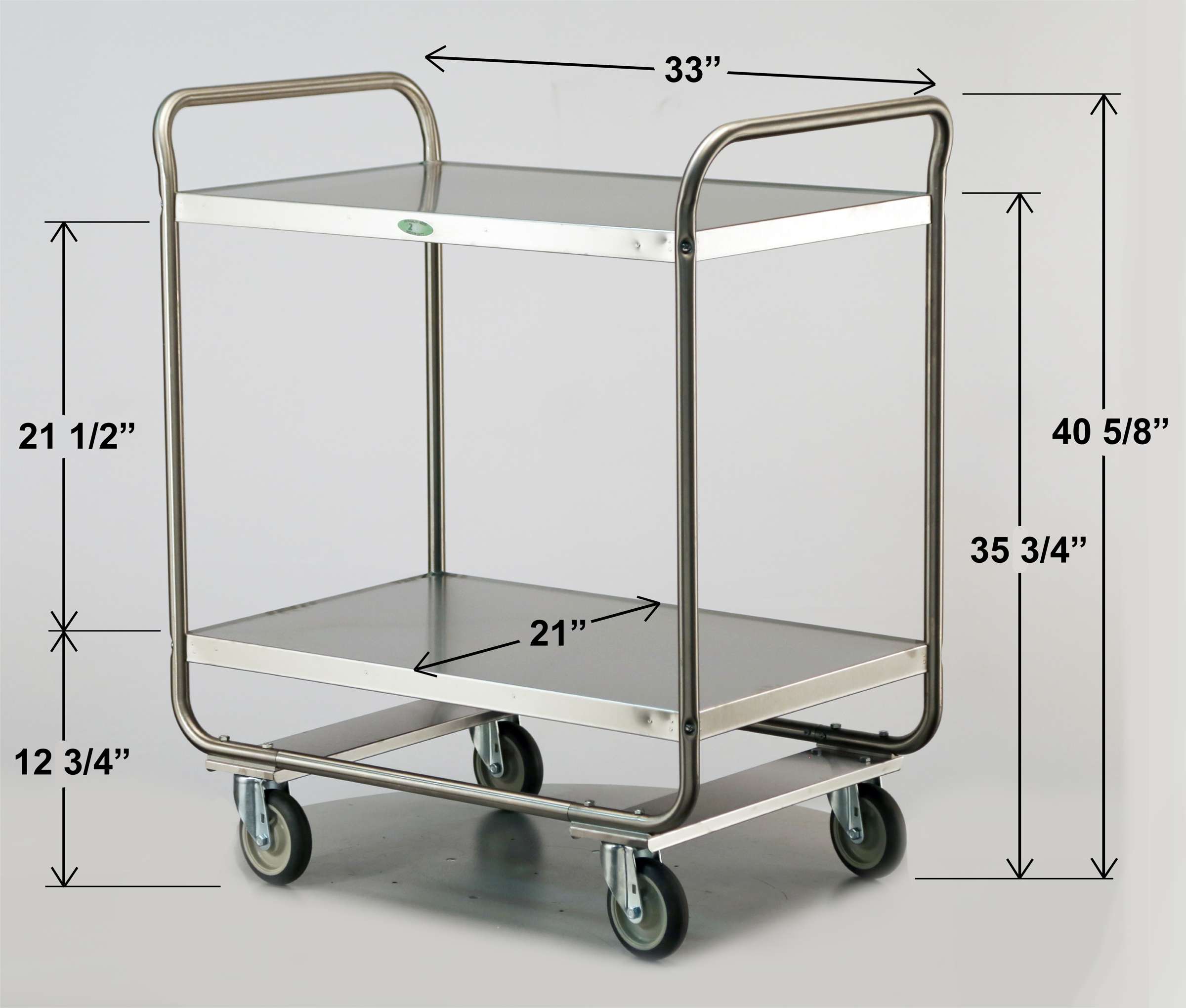 Product Specification: Unit shall be Lakeside Model 243 and shall have stainless steel shelves secured to tubular legs with screw and nut with a weight capacity of 500-Lb. (136 kg). This cart shall have 2 ea. open shelves measuring 21" x 33" and be constructed of 20-gauge stainless steel. Shelves shall have 21-1/2" clearance with reinforced edges. U-frame shall have 18-gauge 1” thick stainless steel round tubing forming integrated push handle on two ends. Bottom corners shall be rounded. Four each 5" no-mark, cushion tread swivel stem casters shall be secured through holes on bottom tube with acorn nut. Unit shall be listed as medium duty. Unit shall be NSF listed. Made in USA.