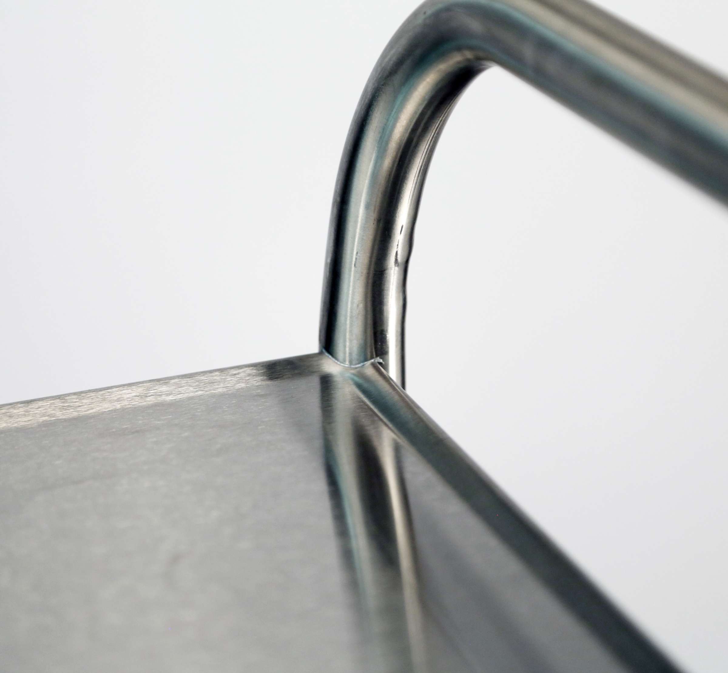 - 20-gauge stainless steel shelves have reinforced edges for heavy loads and load drops. Legs are 16 gauge stainless steel.