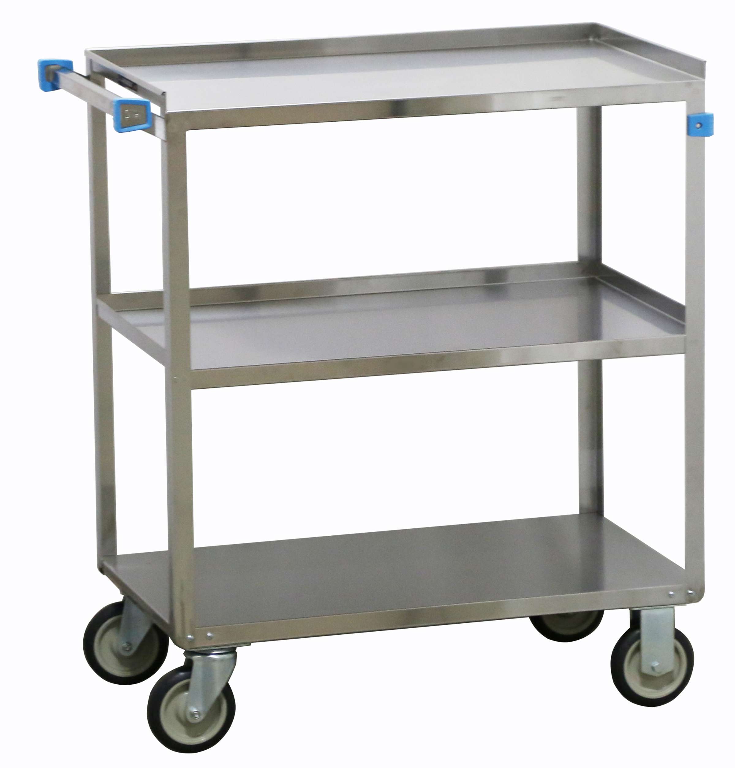 Product Specification: Unit shall be Lakeside Model 352 and shall have stainless steel resistance spot welding to fasten shelves and handle to frame with a weight capacity of 500-Lb. (227 kg). This cart shall have 3 ea. open shelves measuring 18" x 31" and be constructed of 20-gauge stainless steel. Shelves shall have 13-1/8" clearance and be reinforced with a hemmed front. Shelves shall have 3 edges up, 1 down. All-welded angle legs shall be constructed of 16-gauge stainless steel. Unit shall have a stainless steel push handle welded to frame, and shall have corner bumpers mounted to front legs and ends of push handle. Unit shall have an independent galvanized steel dolly frame fastened to the bottom with 8 screws. Bottom corners shall be rounded. Two swivel, two fixed 5" double race, double-ball bearing casters shall be mounted to the dolly frame. Casters shall be of no-mark, cushion-tread. Unit shall be listed as medium duty. Made in USA.