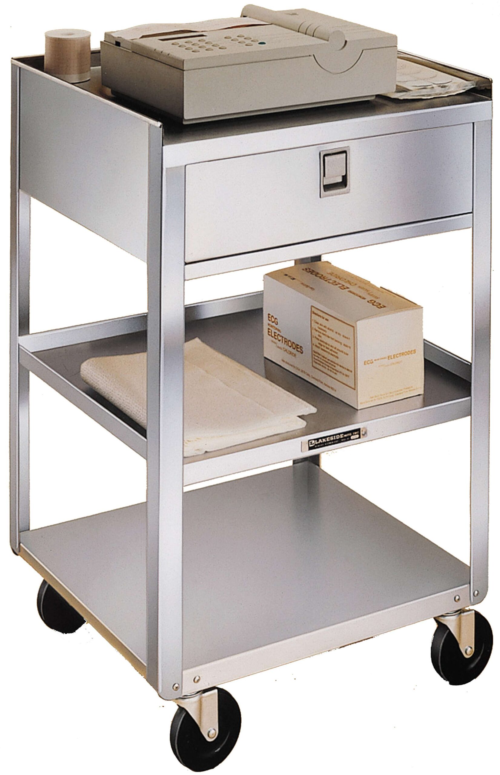 Equipment Stands by Lakeside Manufacturing move and store medical equipment and supplies wherever it is needed. The Lakeside 356 Equipment Stand with (1) drawer has (3) shelves measuring 16-3/4" x 18-3/4" and a weight capacity of 300-Lb. This Lakeside cart's open base, drawer, and multiple shelves provide ample storage space for medical supplies and equipment. This medical equipment stand's sound deadening panels restrict vibrations and reduce noise during transport, while its stainless steel construction is durable for carrying heavy equipment and easy to clean and sanitize. This cart's all-swivel casters allow for smooth and quiet maneuverability in tight spaces. Optional locks available for one and two drawer models. Optional brakes available for two casters. Largest selection of carts on the market. Superior lead times. Made in the USA.