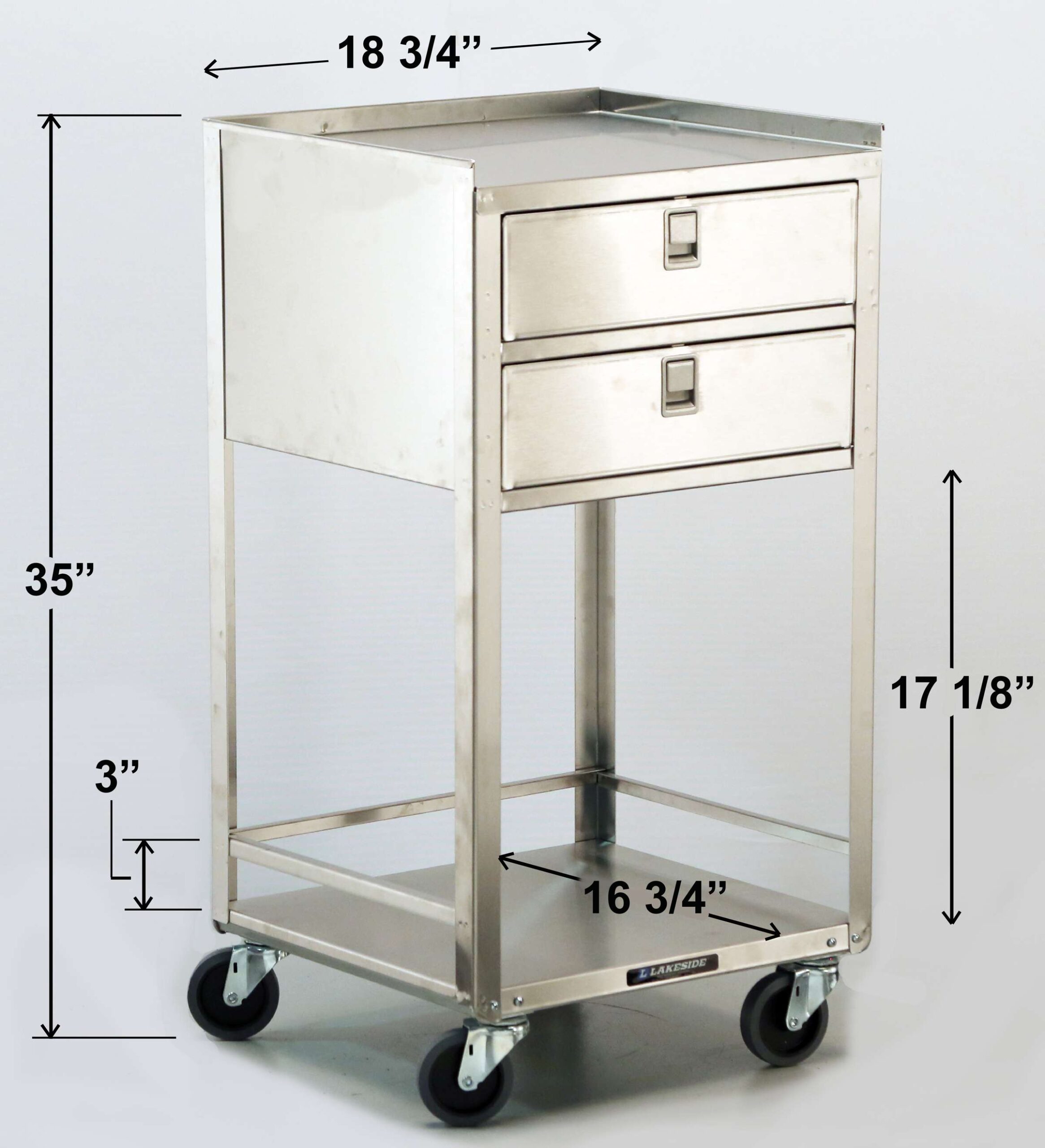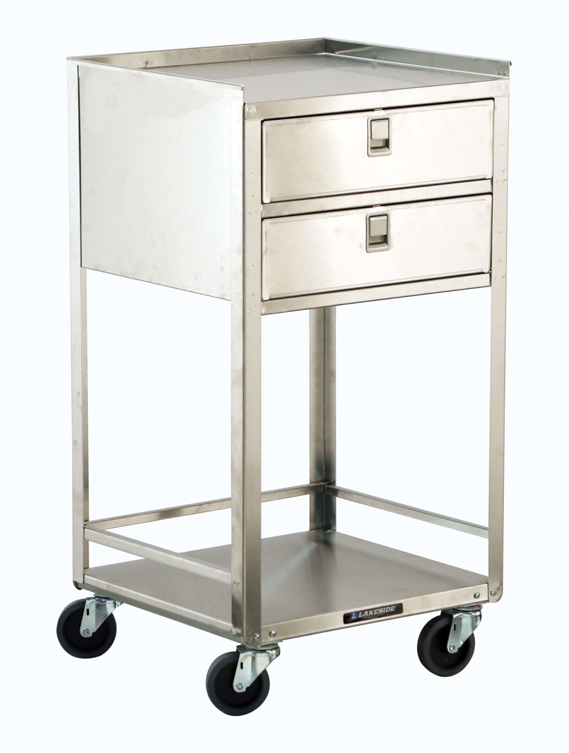 Equipment Stands by Lakeside Manufacturing move and store medical equipment and supplies wherever it is needed. The Lakeside 358 Equipment Stand with (2) drawers has (2) shelves measuring 16-3/4" x 18-3/4" and a weight capacity of 300-Lb. This Lakeside cart's two shelves and two drawers provide ample storage space for medical supplies and equipment. This medical equipment stand's sound deadening panels restrict vibrations and reduce noise during transport, while its stainless steel construction is durable for carrying heavy equipment and easy to clean and sanitize. This cart's all-swivel casters allow for smooth and quiet maneuverability in tight spaces. Optional locks available for one and two drawer models. Optional brakes available for two casters. Largest selection of carts on the market. Superior lead times. Made in the USA.