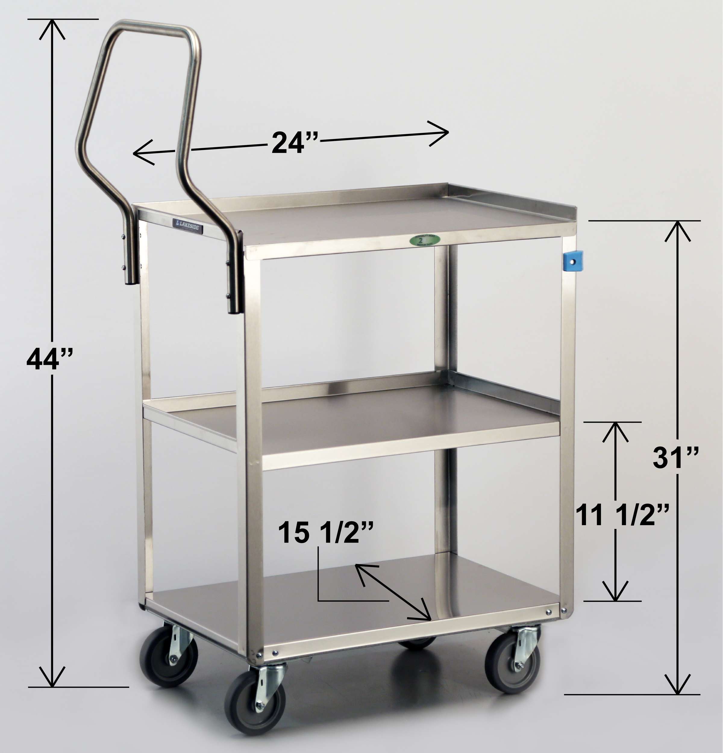 Product Specification: Unit shall be Lakeside Model #4411 and shall have stainless steel unitized electronic welding to fasten shelves to frame with a weight capacity of 500-Lb. This cart shall have 3 ea. open shelves measuring 15-1/2" x 24" constructed of 20-gauge stainless steel. Shelves shall have 11-1/2" clearance and be reinforced with a hemmed front. All-welded angle legs shall be constructed of 16-gauge stainless steel. Unit shall have a stainless steel vertical push handle fastened to frame with 4 screws. Corner bumpers shall be mounted to front legs. Unit shall have an independent galvanized stainless steel dolly frame fasted to the bottom with 8 screws. Bottom corners shall be rounded. Four each 4" double race, double-ball bearing swivel casters shall be mounted to the dolly frame. Unit shall be listed as medium duty. Made in the USA.