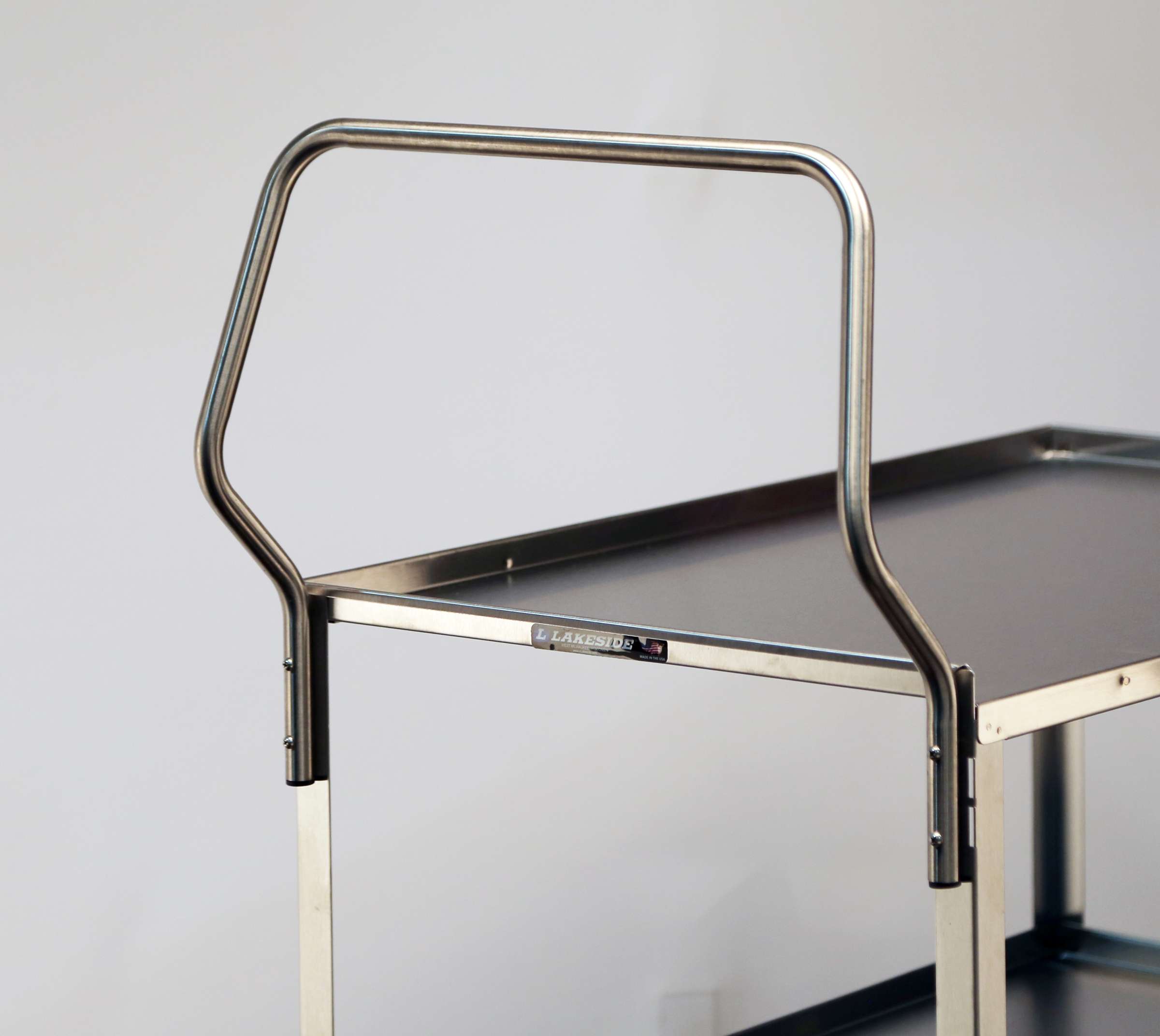 Product Specification: Unit shall be Lakeside Model #4459 and shall have stainless steel unitized electronic welding to fasten shelves to frame with a weight capacity of 500-Lb. This cart shall have 3 ea. open shelves measuring 21" x 49" constructed of 20-gauge stainless steel. Shelves shall have 13-1/8" clearance and be reinforced with a hemmed front. All-welded angle legs shall be constructed of 16-gauge stainless steel. Unit shall have a stainless steel vertical push handle fastened to frame with 4 screws. Corner bumpers shall be mounted to front legs. Unit shall have an independent galvanized stainless steel dolly frame fasted to the bottom with 8 screws. Bottom corners shall be rounded. Four each 5" double race, double-ball bearing, no-mark, cushion-tread swivel casters shall be mounted to the dolly frame. Unit shall be listed as medium duty. Made in the USA.