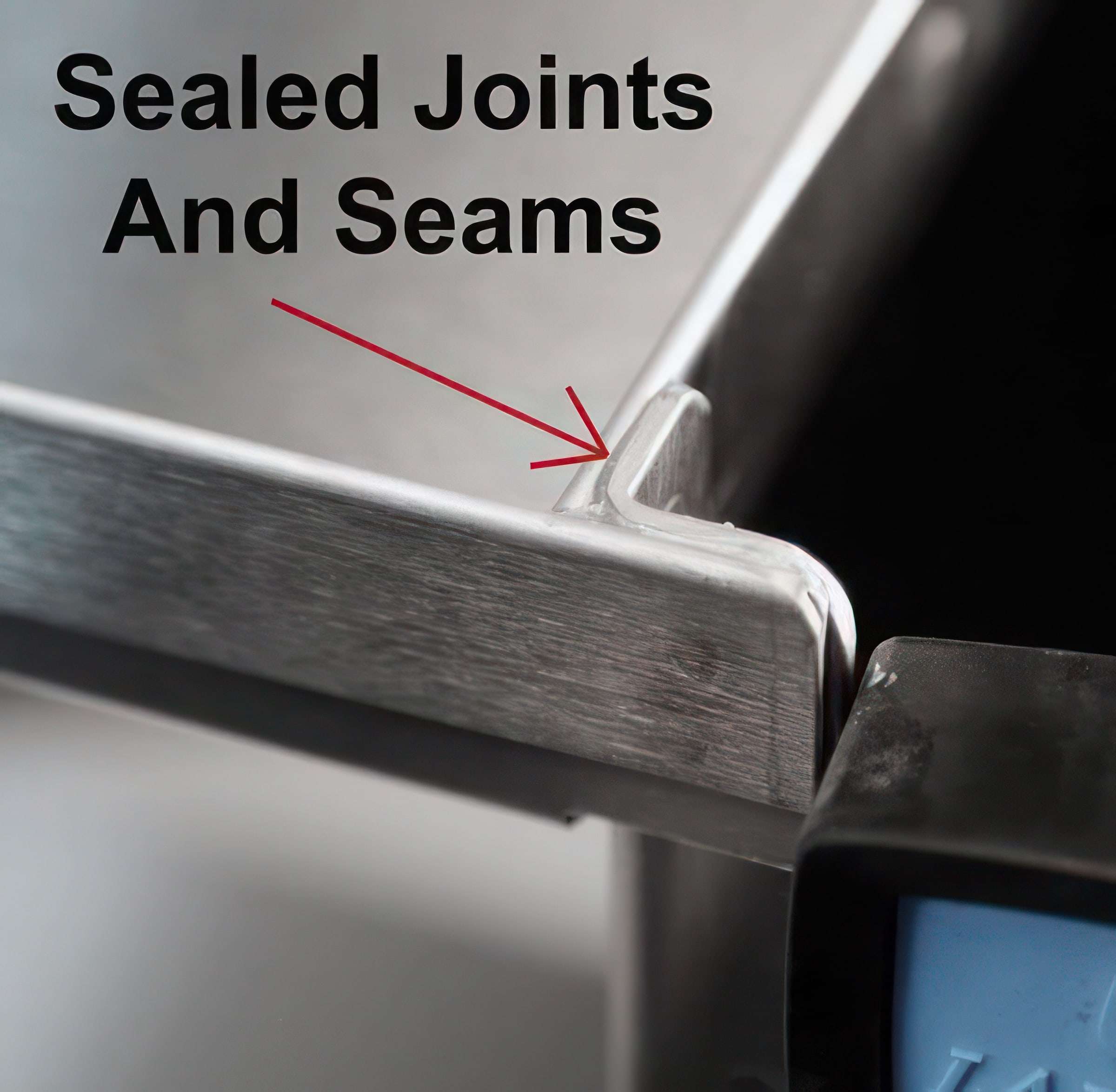 Product Specification: Unit shall be of fully welded stainless steel construction. Legs and frame shall be of U-frame design, eliminating the need for corner reinforcements. Leg frames shall be 11-gauge angle stainless steel. Shelves shall be of 18-gauge stainless steel and shall be welded to vertical leg frames. Shelves shall be double hemmed on all four edges for extra rigidity. Unit shall have two each 5" (127 mm) diameter extra-load swivel casters with 1-1/4" (32 mm) wide non-marking polyurethane wheels, and two each 8" diameter extra-load wheels mounted to a fixed axle. Swivel casters shall be plate type and shall be bolted to an 18-gauge 5" (127 mm) wide stainless steel cross member with a galvanized reinforcement. Unit shall have push handle made of 18 gauge 1" O.D. stainless steel tubing. Handle mounting brackets shall be welded to vertical leg frame. Unit shall have two each bumpers mounted to handle ends and two each 6" (152 mm) vertical bumpers riveted to front legs.
