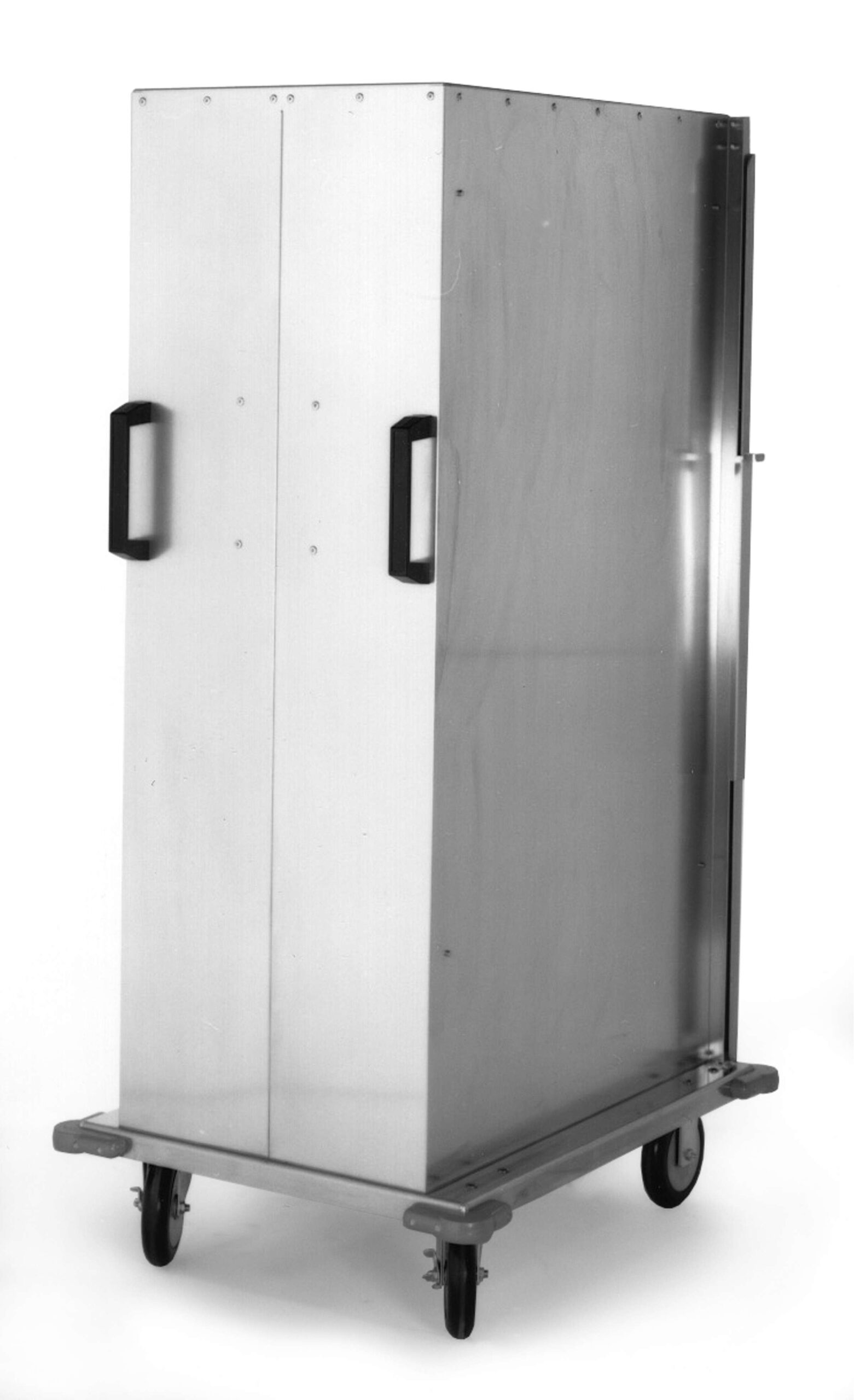 Product Specification: Unit shall be Lakeside Model 542 and shall be made of an aluminum construction. Unit shall be enclosed with (1) door and vertical push handles. Unit shall hold (24) 14” x 18” trays with a 5” ledge spacing. Unit shall have a perimeter bumper and be NSF certified. Unit shall have (2) 6” fixed and (2) 6” swivel casters. Made in the USA.