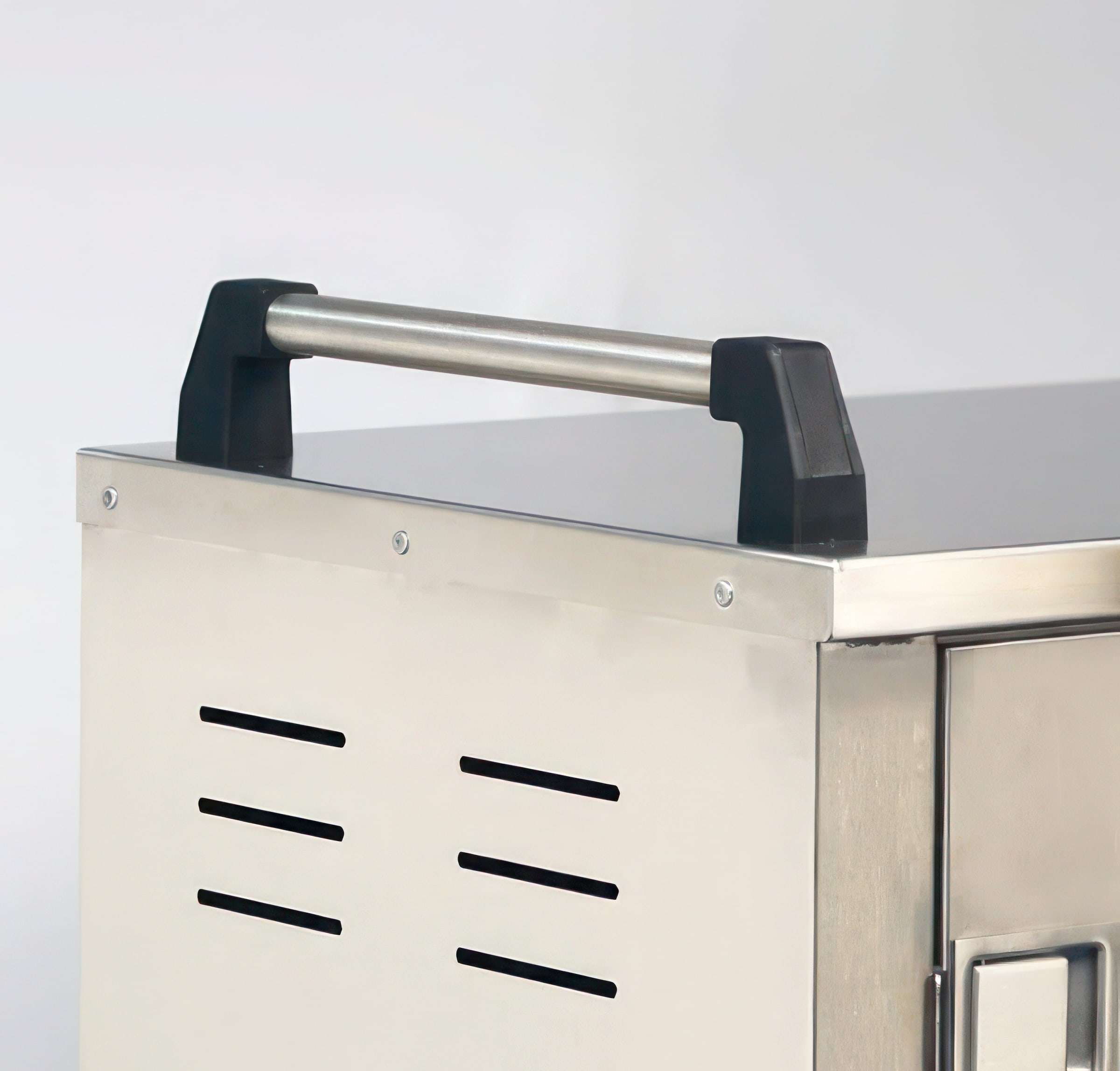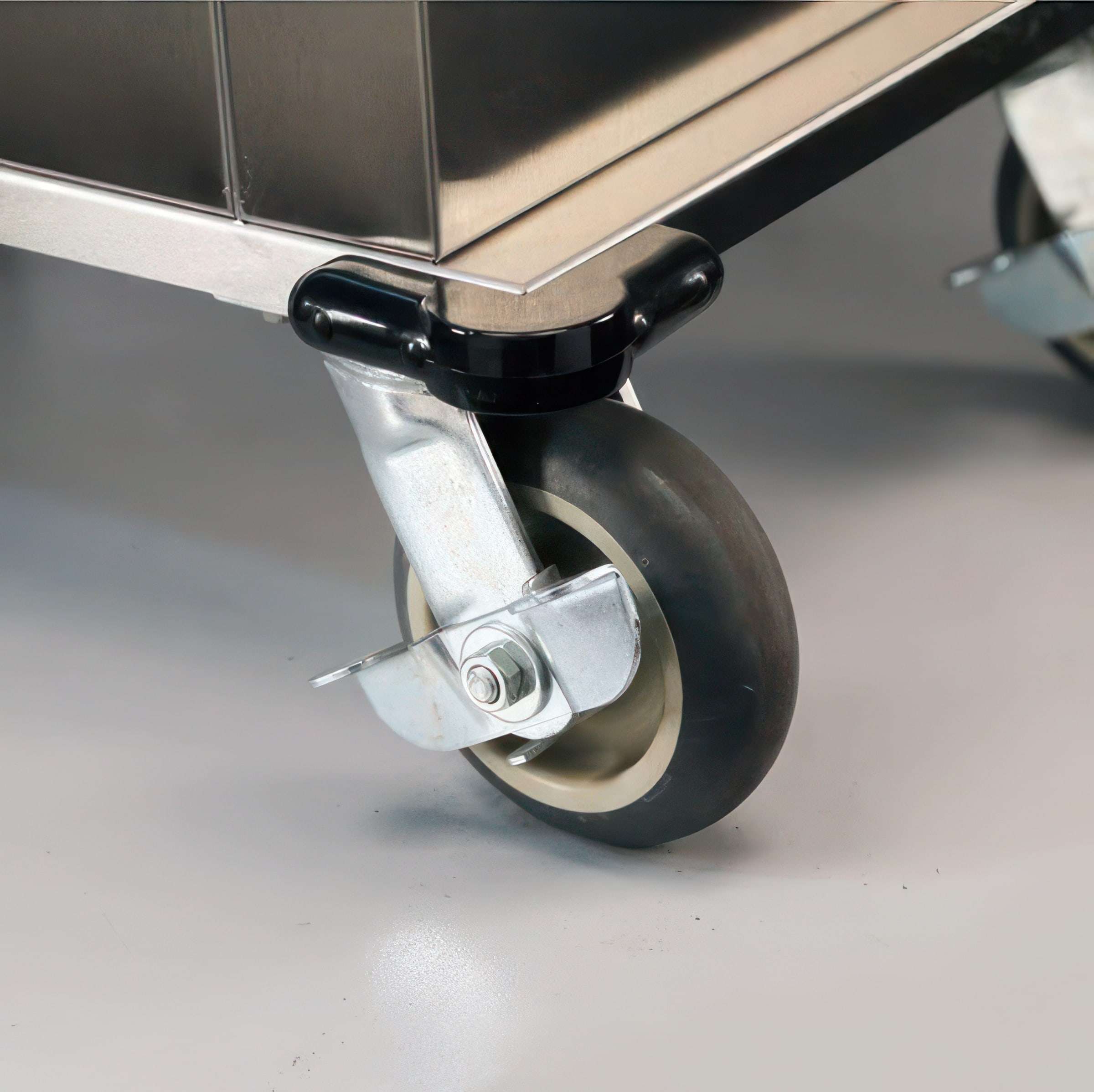 Product Specification: Unit shall be of stainless steel welded andriveted construction to accommodate 14” x 18” or 15” x 20” trays. Material thickness shall be of 16 gauge for top and floor/base, 20 gauge for sides and back. Door shall be of 20 gauge insulated double-pan design, and shall be mounted to unit frame with two each 3” (76 mm) heavy-duty stainless steel hinges. Shall have welded 1” tubular push handle. Hinges shall be welded to door and unit frame. Door shall swing 270° to provide full access to tray compartment, and shall be easily removable by lifting off of hinges. Door latch shall be recessed paddle design. Tray ledges shall be 18 gauge stainless steel angle, welded to an 18 gauge stainless steel frame panel at 6” (152 mm) spacing. Ledge panels shall accommodate both 14” x 18” or 15” x 20” trays, and shall be removable for easy cleaning. Tray compartment shall have vents on end panels and shall have perforated center floor drains. Unit base shall have 1¼” (32 mm) thick extruded PVC rounded bumpers mounted to corners. Unit shall have four each extra-load plate type casters, two fixed and two swivel, mounted to a 14 gauge stainless steel dolly on unit base. Swivel casters shall have shielded ball bearing races and zerk filltings for lubrication of bearings. Caster wheels shall be 6” (152 mm) diameter with 2” wide, non-marking, rounded cushion tread. Unit shall be NSF listed.