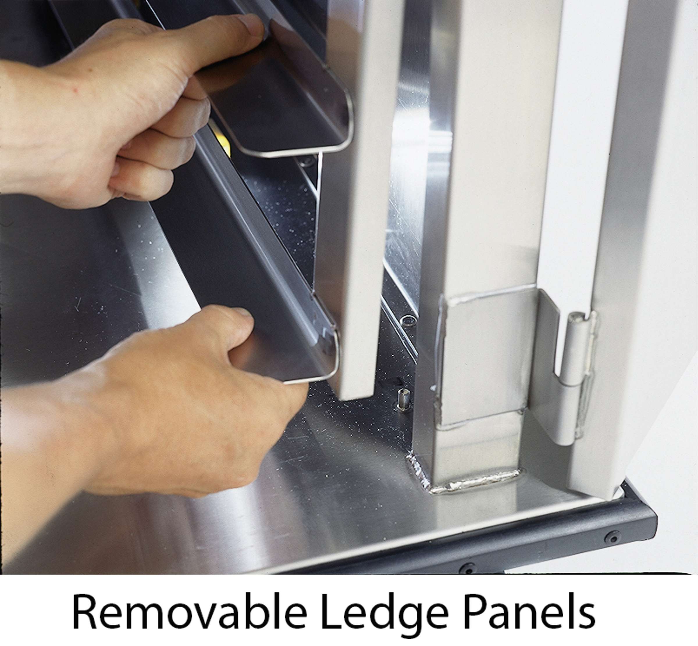 Product Specification: Unit is of stainless steel welded and riveted construction to accommodate 14” x 18” (356 x 457 mm) or 15”x 20” (381 x 508 mm) trays. Material thickness is 16-gauge for top and floor/base, 18-gauge for back and sides. Door(s) are 20-gauge insulated double-pan design, and are mounted to unit frame with three each 3” (76 mm) heavy-duty stainless steel hinges. Hinges are welded to door(s) and unit frame. Door(s) can swing 270° to provide full access to tray compartments, and are easily removable by lifting off of hinges. Doors can be held in full open position by hold-open catches. Door latches are recessed paddle design. Tray ledges are 18-gauge stainless steel angle, welded to a 16-gauge stainless frame panel at 5” (127 mm) spacing. Ledge panels accommodate 14” x 18” or 15” x 20” trays, and are removable for easy cleaning. Tray compartment(s) have vents on sides and back panels and have perforated floor center drain(s). Unit features 1” (25.4 mm) thick extruded PVC perimeter bumper mounted to unit base, and recessed rubber coated vertical push handles on both ends of unit. Casters are extra-load plate-mount type, mounted to 12- gauge glavanized steel channels on unit base. Casters have shielded swivel ball bearing races and zerk fittings for lubrication of swivel and hub bearings. Caster wheels are 6” (152 mm) diameter with 2” wide rounded tread of non-marking cushion material. Two casters have wheel brake. Unit is NSF listed.