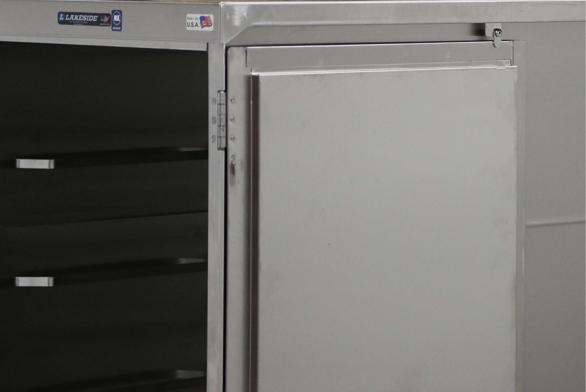 A compact delivery cart is a durable solution for tight storage spaces and navigating narrow hallways. The Lakeside 850 has a 20 tray capacity that fits 15" x 20" trays with 1 door and is NSF. This unit maneuvers easily with its compact size. Long-life door latch withstands repeated opening/closing. This model has ample 6” (152) ledge spacing fitting 2 trays per ledge. 5" all swivel and No-Mark stainless steel casters. This unit’s 200 stainless steel construction is durable and easy to clean/sanitize. Fastest in industry lead times from Lakeside’s factory in the USA.