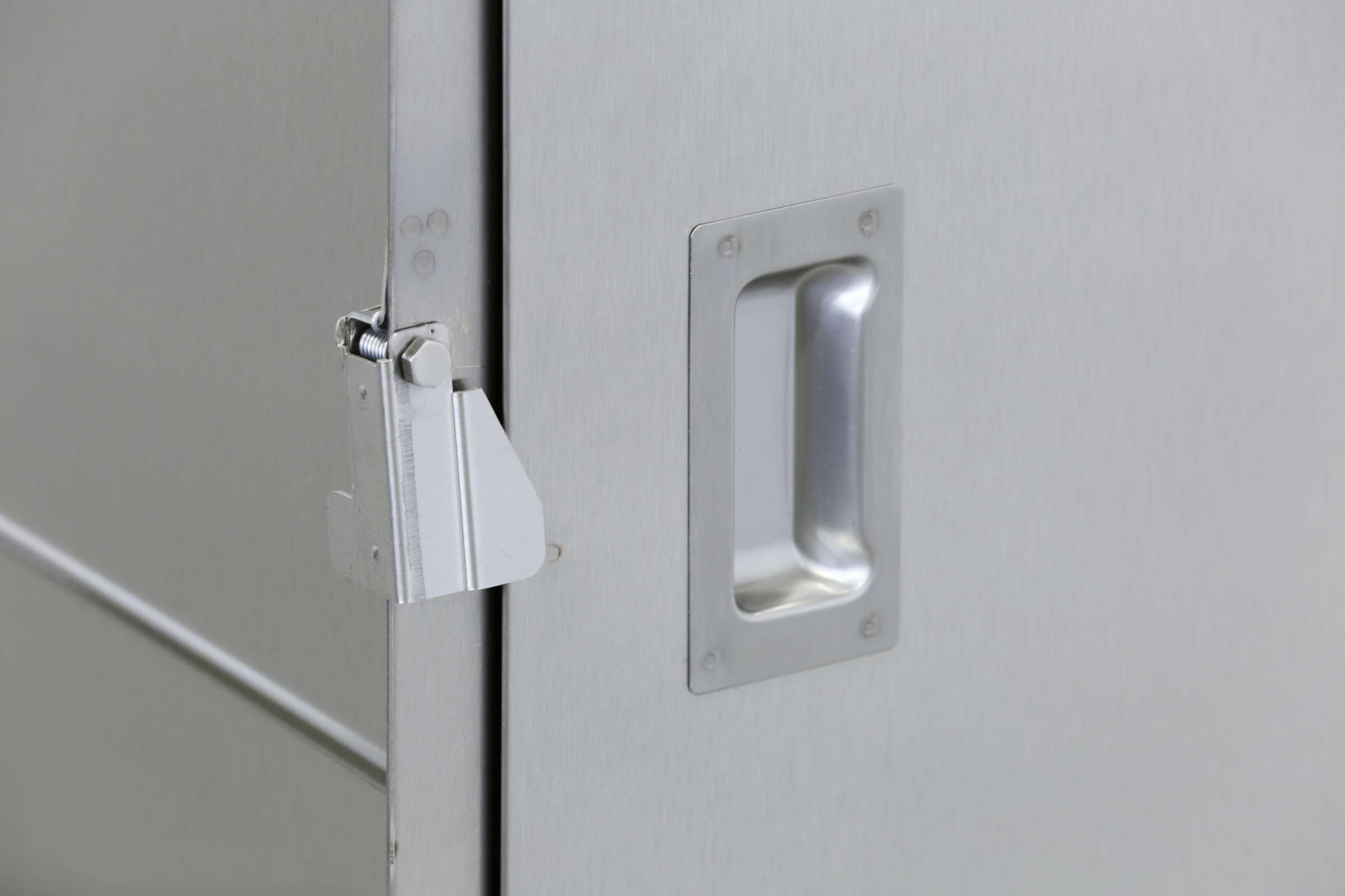 Product Specification: Unit shall be of fully welded stainless steel construction and shall accommodate either 14” x 18” (356 x 457 mm) or 15” x 20” (381 x 508 mm) meal trays. Unit back, top and sides shall be of 18-gauge stainless steel. Compartment floor shall be of 22-gauge stainless steel. Tray ledges shall be of .104 x 1” strip stainless steel. Ledges shall have 6” (152 mm) spacing and shall accommodate two trays per level. Door(s) shall be of 22-gauge double pan stainless steel, with 1” (25 mm) polystyrene insulation for sound deadening and shall have spring-loaded swing type latch. Door(s) shall swing open 270° and shall lock in an open position. Casters shall be stainless steel corner mounted stem type 5” (127 mm) diameter swivel, with shielded bearing and non-marking polyurethane wheels. Unit shall be NSF listed.