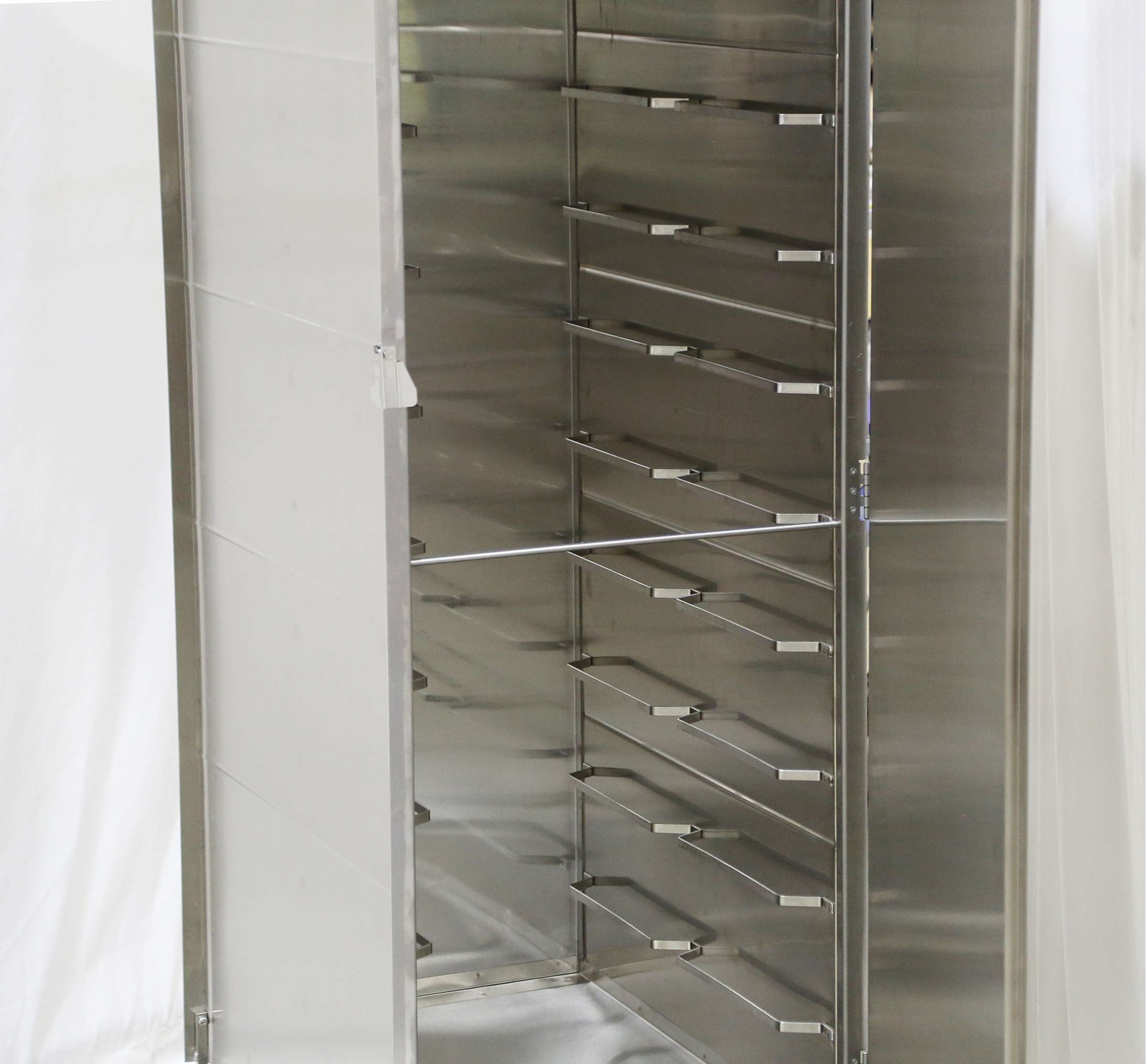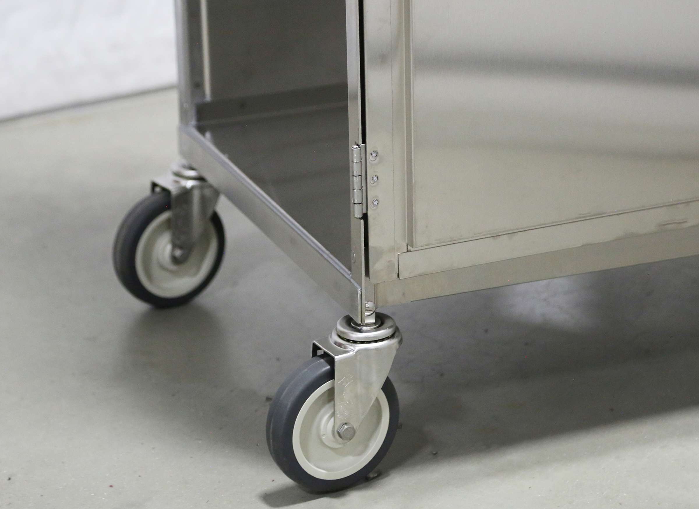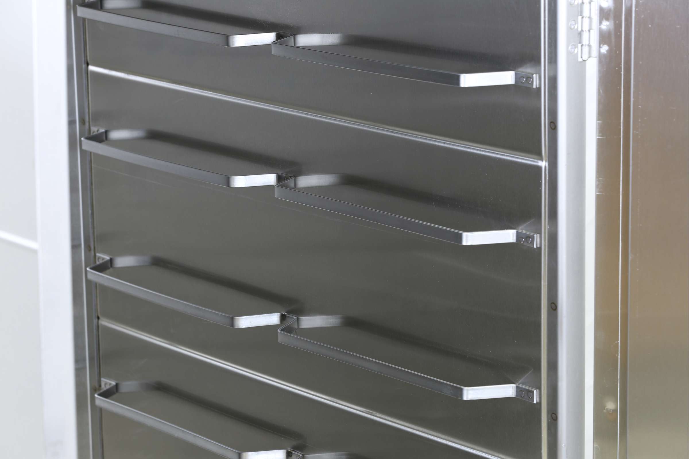 Product Specification: Unit shall be of fully welded stainless steel construction and shall accommodate either 14” x 18” (356 x 457 mm) or 15” x 20” (381 x 508 mm) meal trays. Unit back, top and sides shall be of 18-gauge stainless steel. Compartment floor shall be of 22-gauge stainless steel. Tray ledges shall be of .104 x 1” strip stainless steel. Ledges shall have 6” (152 mm) spacing and shall accommodate two trays per level. Door(s) shall be of 22-gauge double pan stainless steel, with 1” (25 mm) polystyrene insulation for sound deadening and shall have spring-loaded swing type latch. Door(s) shall swing open 270° and shall lock in an open position. Casters shall be stainless steel corner mounted stem type 5” (127 mm) diameter swivel, with shielded bearing and non-marking polyurethane wheels. Unit shall be NSF listed.