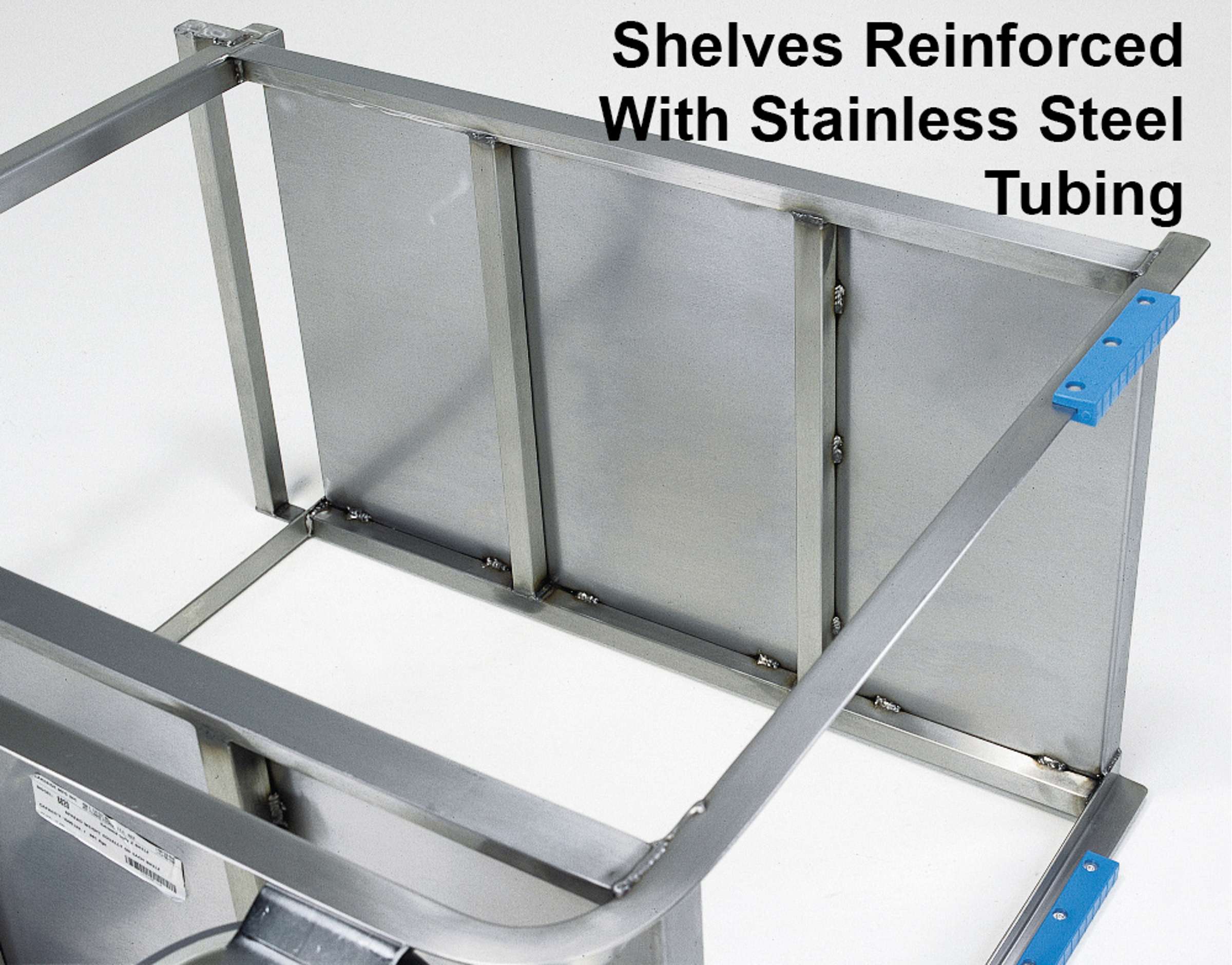 - 1” thick square tubing reinforcement under 14-gauge shelves withstands heavy object drops, even on shelf edge.