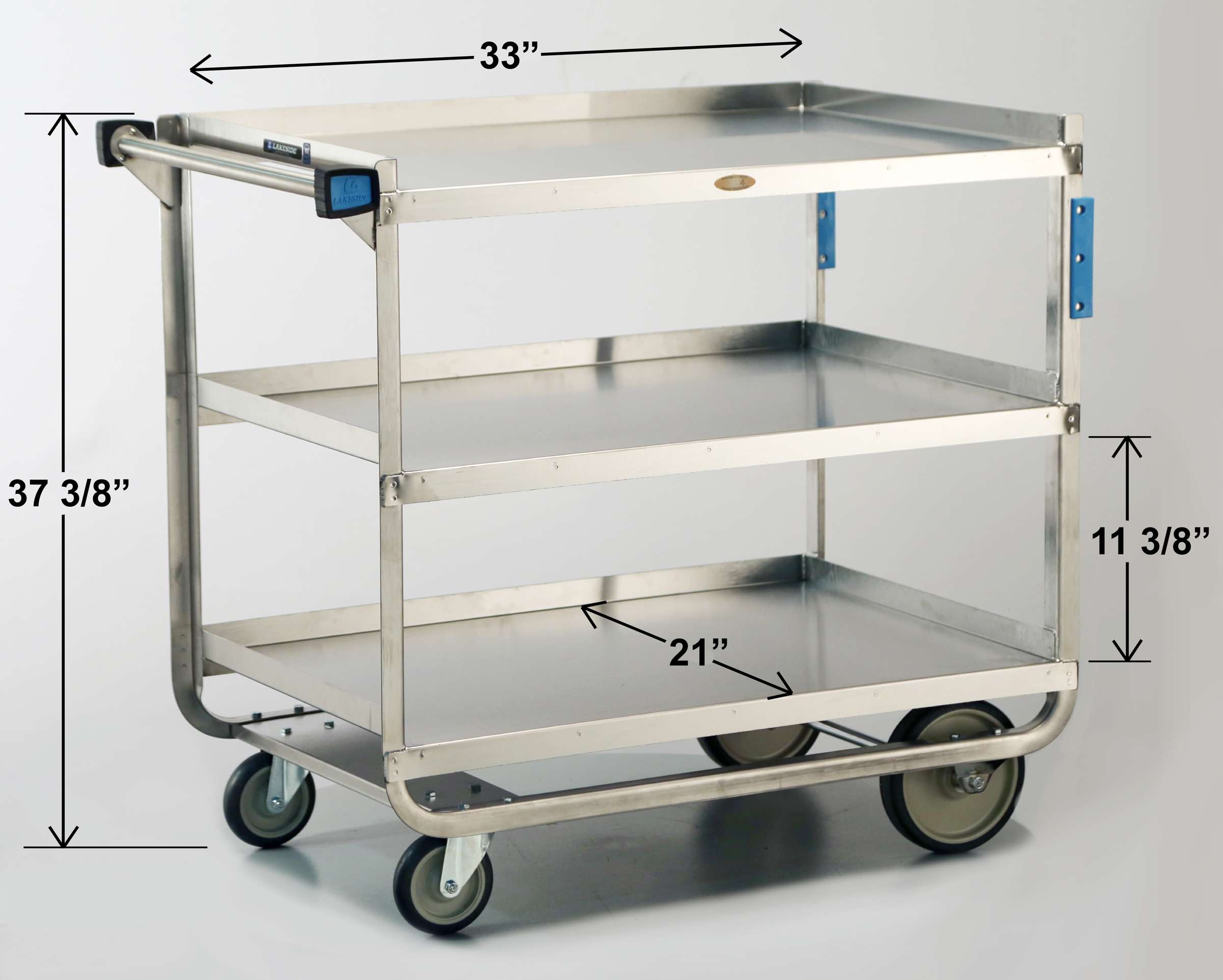 Stainless Steel Utility Carts by Lakeside Manufacturing are ideal for receiving dock and storage room use, loading and moving medical supplies and equipment, and transporting heavy-duty loads up to 1000-Lb. over uneven surfaces. The Lakeside 944 Stainless Steel Utility Cart with (3) shelves measuring 21" x 33" has a weight capacity of 1000-Lb. This Lakeside cart's larger 8” (203) front wheels allow cart to transition over uneven surfaces with ease. Its fixed front wheels help guide cart in a straight line, while making easier to navigate corners. This medical utility cart's angled “u”-shaped frame design provides superior structural strength for larger loads. This utility cart's all joints are full bead welded to better withstand heavy loads and frequent use, while its reinforced edges provide extra capacity for heavy loads. The 944's no-mark, extra load, cushion tread wheels absorb impact, reducing vibration and strain. Its stainless steel construction is easy to clean and sanitize. This Lakeside cart has bumpers on its legs and handles to protect walls and furniture. This model is NSF listed. Endless variety of customizable options. Superior lead times. Made in the USA.