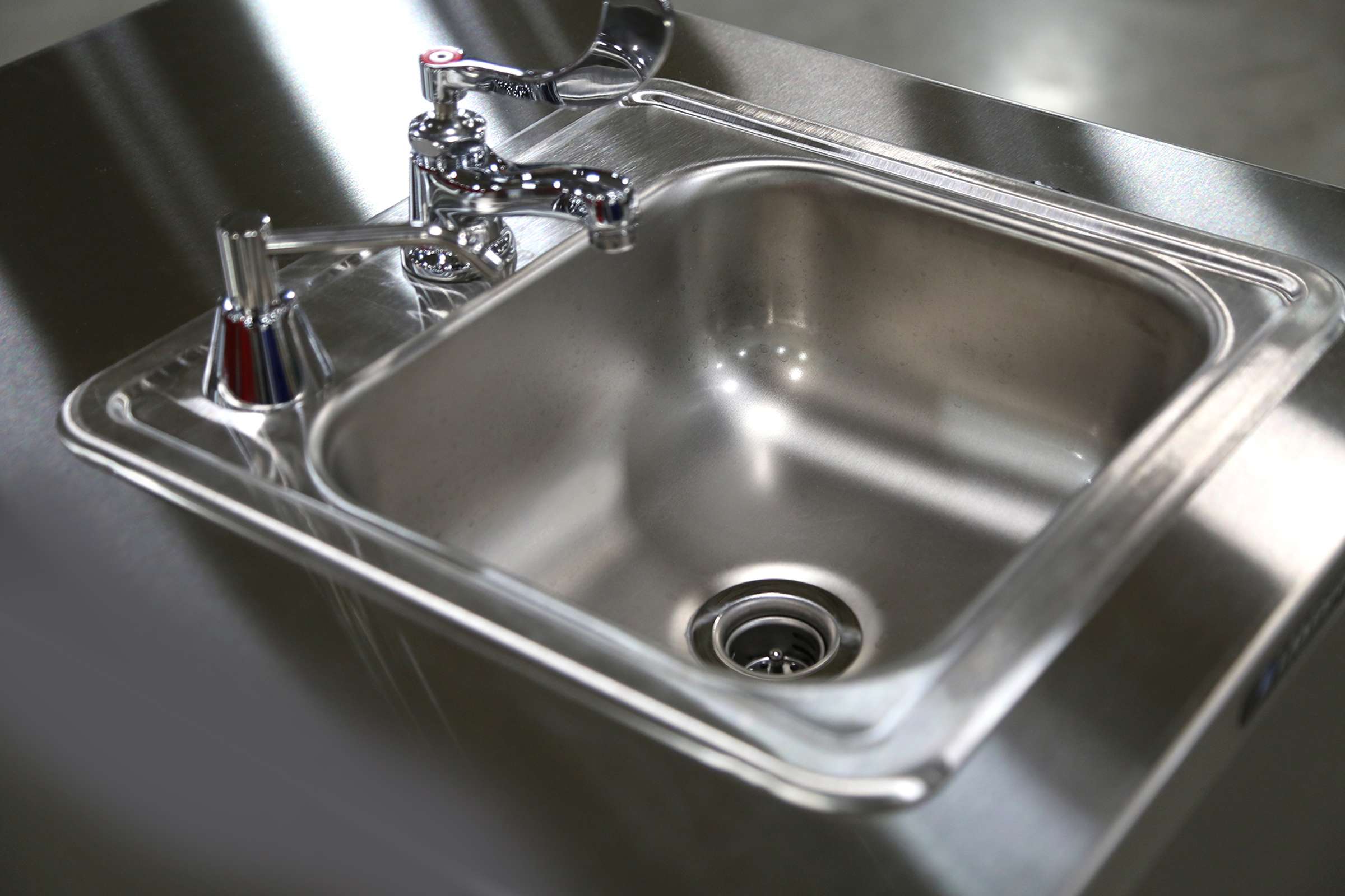 - Sink and cabinet are constructed of durable, easy to clean and sanitize stainless steel.