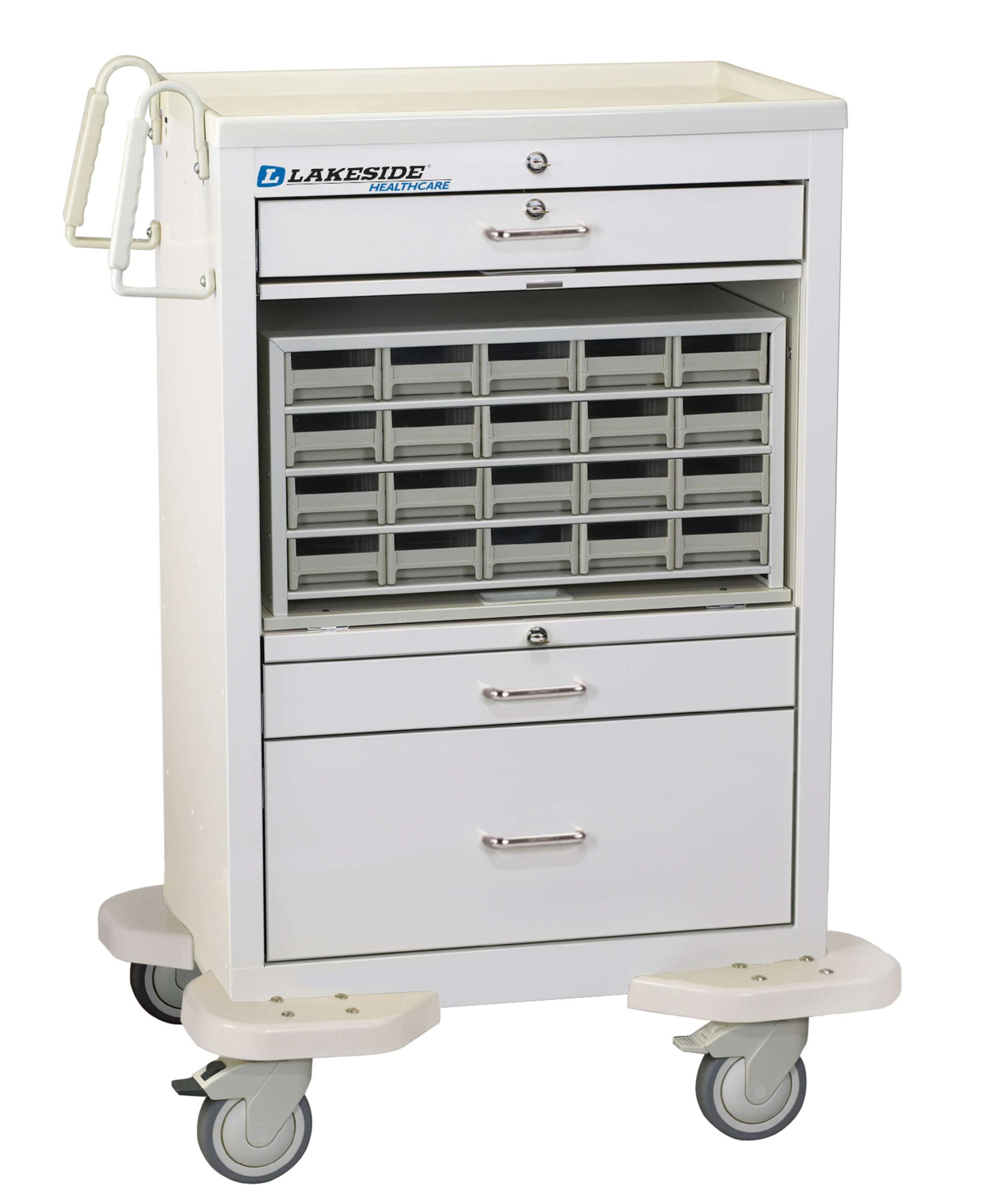 The Lakeside C-330-MUS-TW Specialty Medication Cart has a cassette, 20 bins, and 3 lockable drawers. This cart comes standard in solid traffic white but is available in 22 other optional colors. This cart comes standard in solid traffic white but is available in 22 other optional colors. Unit has (3) drawers, security box, side cabinet, 20 bin cassette, and 20 patient bins. Pull out cassette shelf for easy access and exchange. The side cabinet features top-tilt container and key-locking doors. Removable plastic top and vertical push handles are included. (4) Casters are 5″ premium, all swivel, (2) braking, and (1) with directional lock. Made in the USA.
