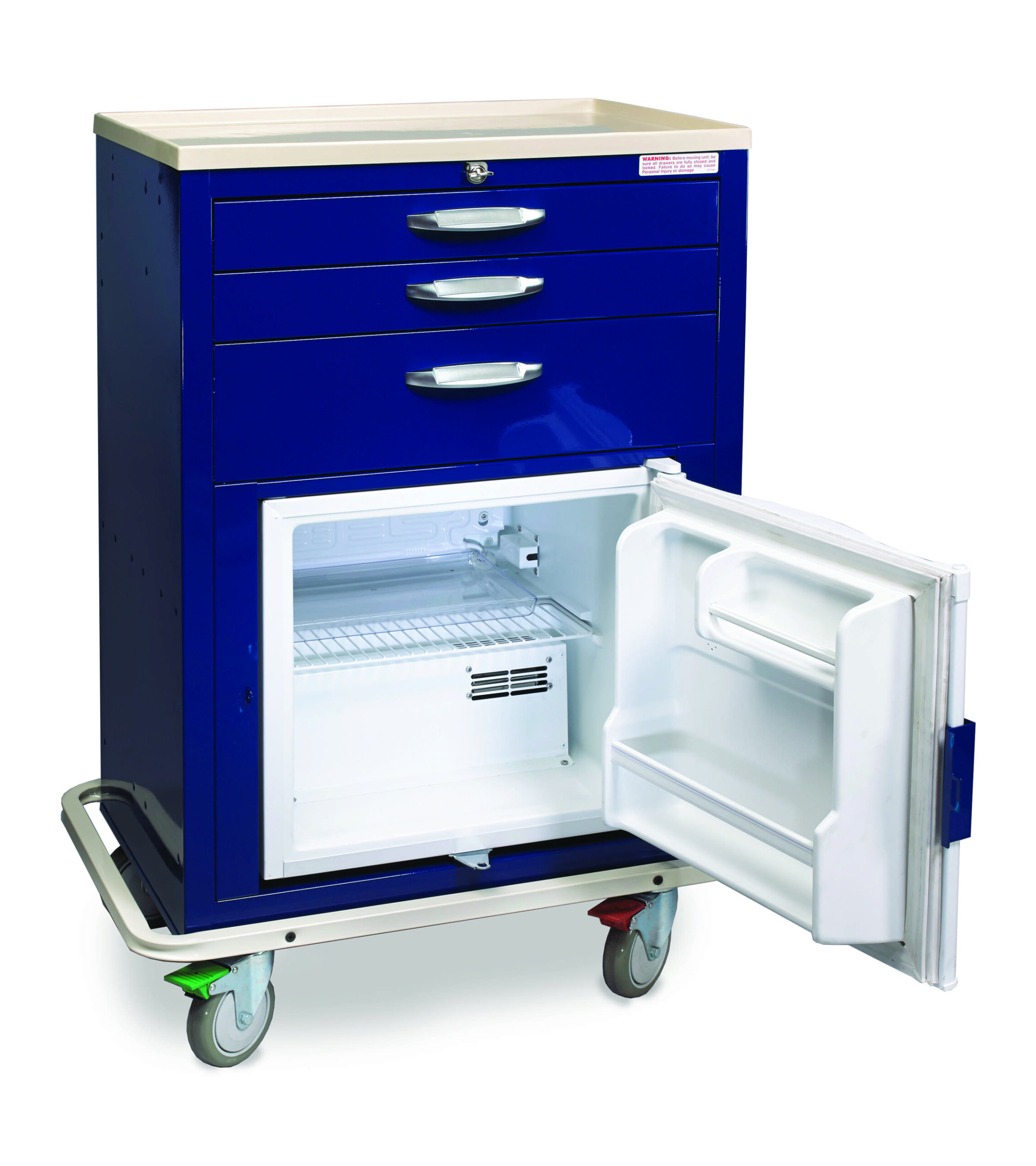The Lakeside SH-330-1B Hyperthermia Cart is blue, with 3 drawers, and a refrigerator /freezer 1.6 cubic feet. Includes 10 cold packs. Features a temperature indicator and a hospital-grade plug w/10' (3048) cord. Contains a security sealing system and a plastic top. Made in USA.