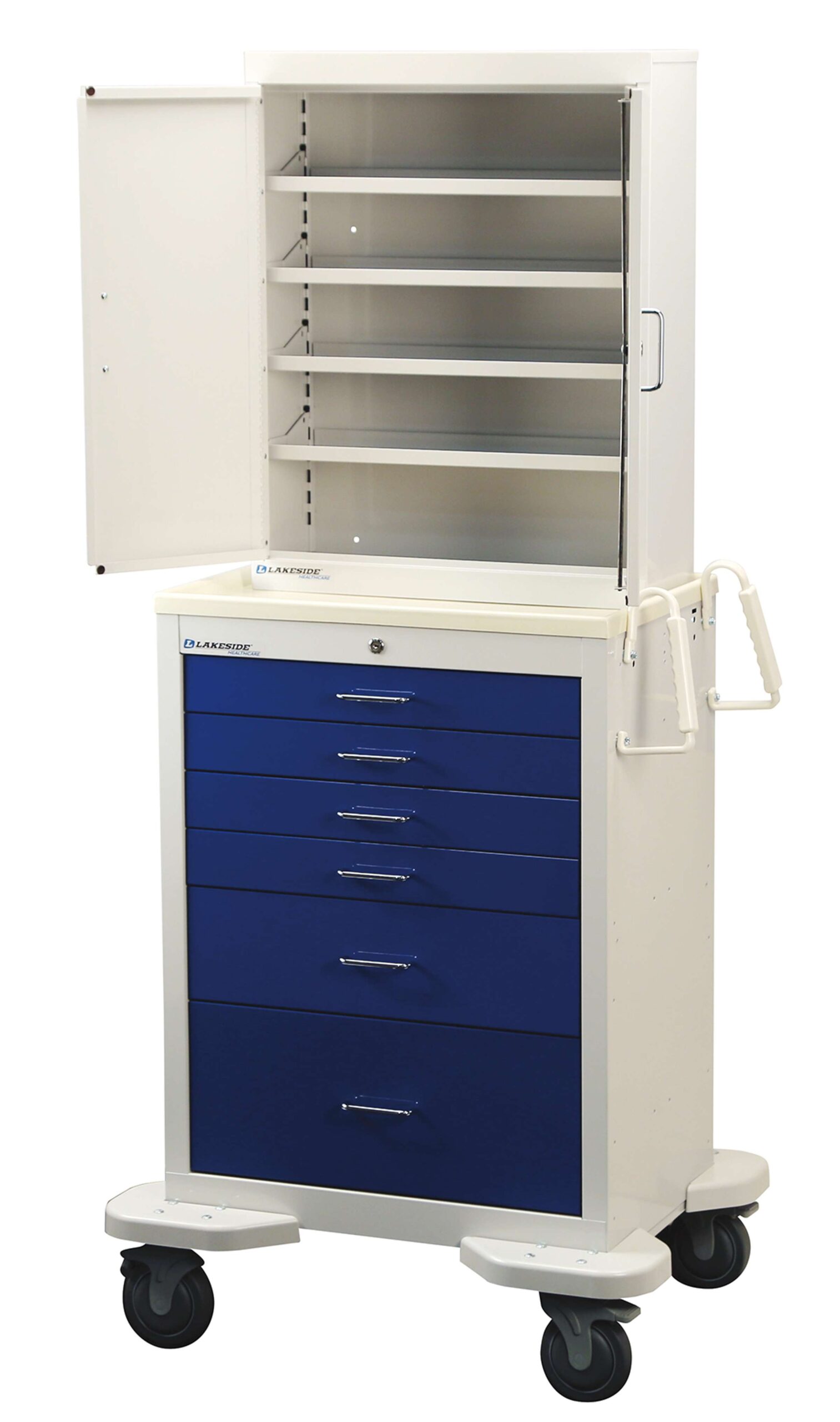The Lakeside SS-627-2B Suture Storage Cart is blue and telegraph gray with a (4) shelf suture cabinet top mounted and has 6 drawers. This unit has (4) 3", (1) 6", and (1) 9" key locking drawers as well as a top-mounted 4-shelf suture cabinet. Vertical push handles included. Casters are 5″ premium, all swivel, (2) braking, and (1) with directional lock. Made in the USA.