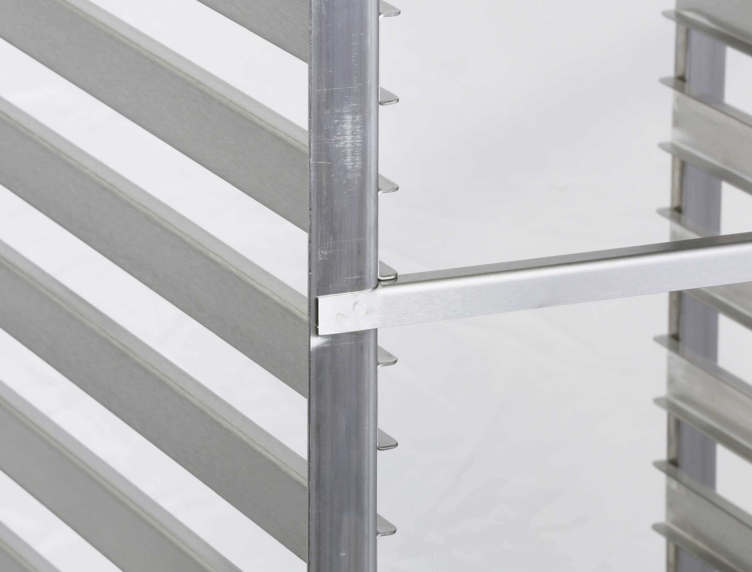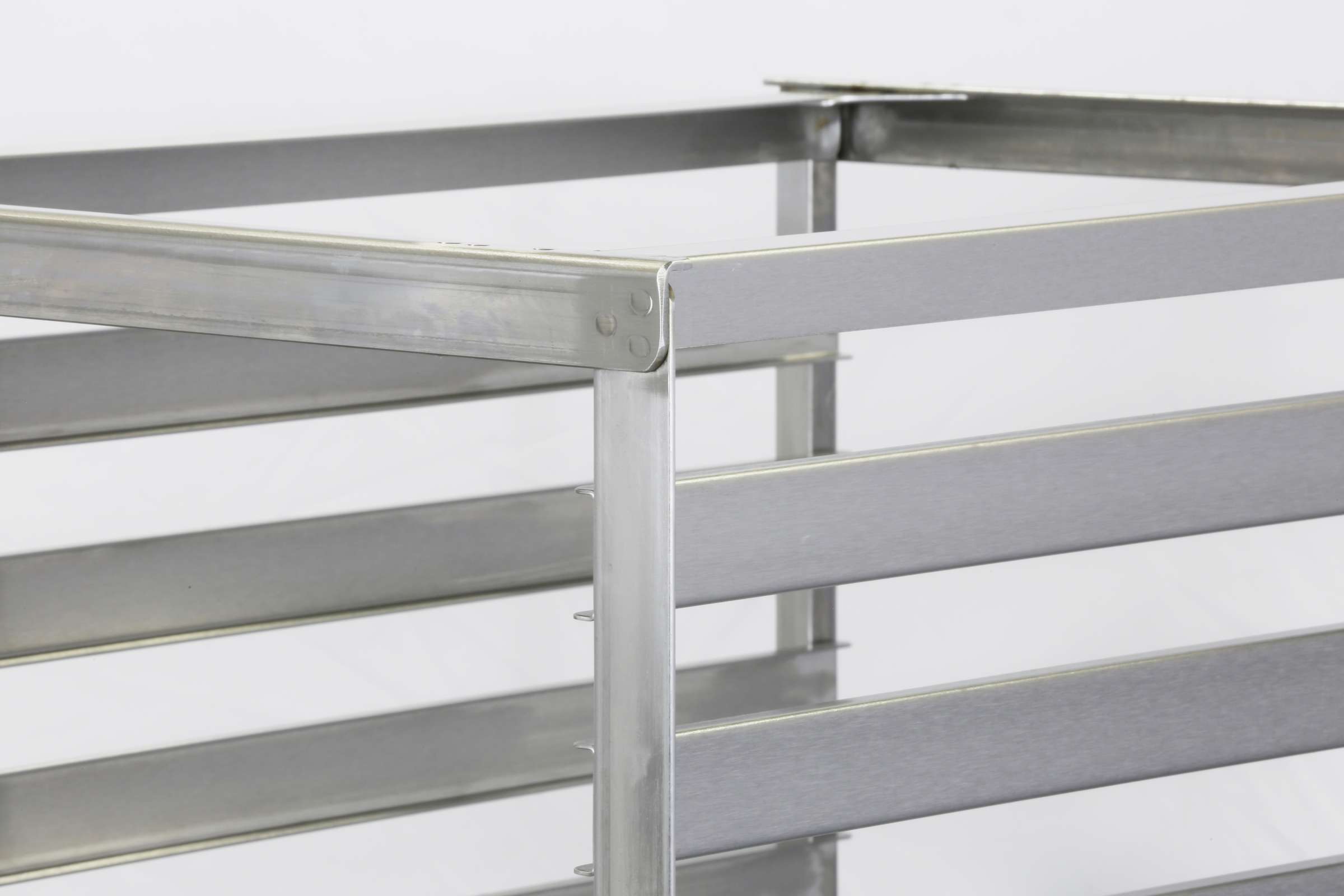 Product Specification: Unit shall be of all-welded construction and shall accommodate 18” x 26” pans or 14” x 18” pans and trays. Corner upright legs, and top and bottom frame shall be of .104 x 3/4” x 1-1/4” angle stainless steel. Pan/tray ledges shall be of 16-gauge stainless steel and shall be welded to upright legs front and back. Top and bottom corner frame joints shall have 20-gauge reinforcing gussets welded in place for extra rigidity. Unit shall have a 16-gauge x 1/2” x 1/2” angle stainless steel horizontal brace welded to upright legs at open ends front and back. Casters shall be 4” diameter swivel stem type, corner mounted to corner legs for upright stability. Unit shall be NSF listed.