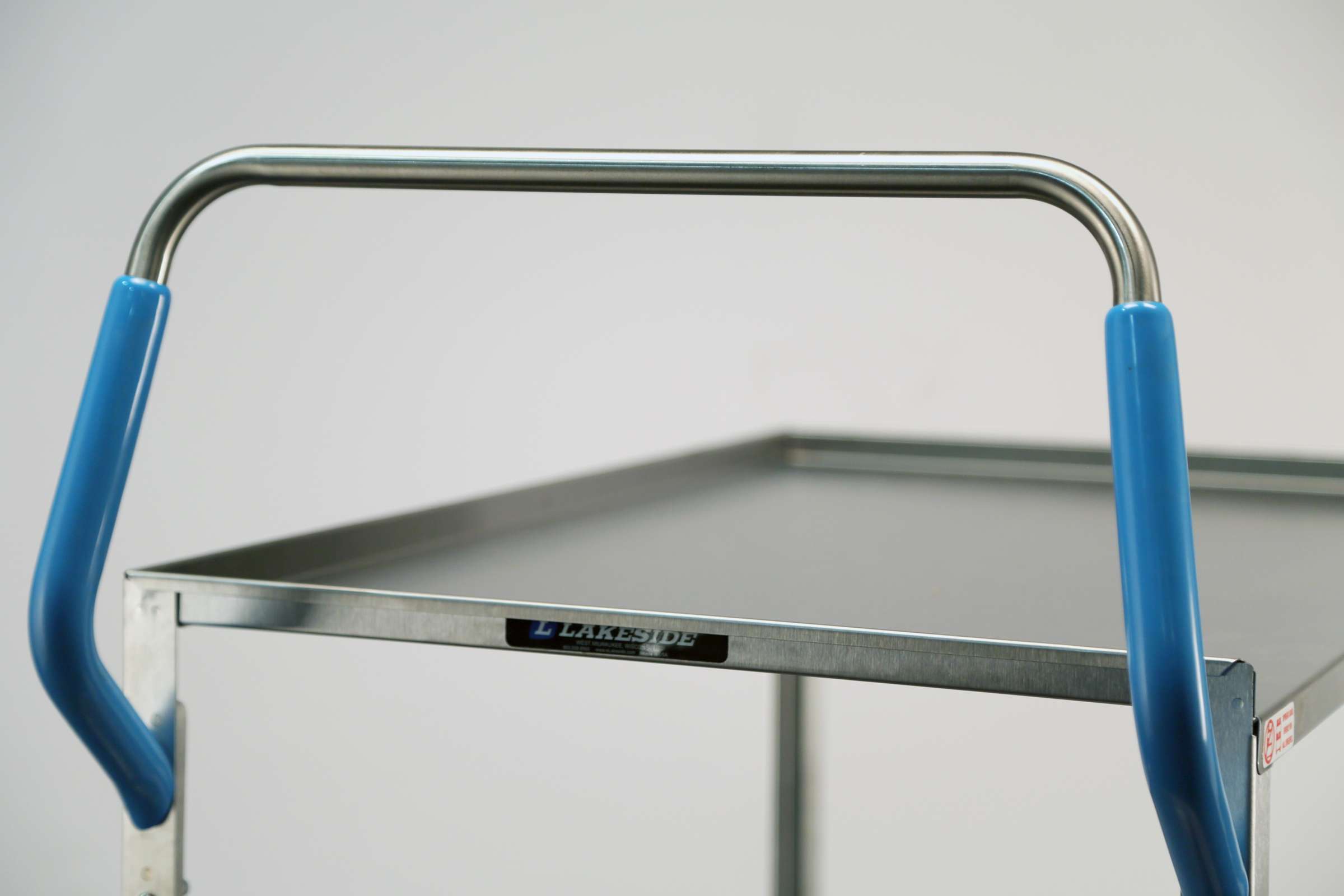 Ergo-One System Utility Carts by Lakeside Manufacturing were designed to reduce injuries caused by improper pushing, lifting and loading. The Lakeside 6800 Ergo-One System Utility Cart with (2) shelves measuring 21" x 49" has a weight capacity of 500-Lb. This utility cart's shelf heights are within a “Safety Zone” that is the proper range for loading and unloading, bottom shelf is 20” (508) from the floor. This Lakeside cart's impact-absorbing, no-mark cushion-tread wheels absorb impact, reducing vibration and strain. This utility cart's 20-gauge stainless steel top shelf and 24-gauge stainless steel bottom shelf are reinforced for added strength, while its all welded construction is durable for structural strength and easier-to-clean surface. This Lakeside cart's stainless steel construction is easy to clean and sanitize. Its ergonomic vertical handle helps prevent wrist, arm and shoulder strains when pushing. This cart's leg bumpers protect walls and furniture, while its reinforced stainless steel shelves and all welded construction. Lakeside has the widest selection on the market and offers custom solutions. Industry leading ship times from Lakeside’s US factory. Made in the USA.