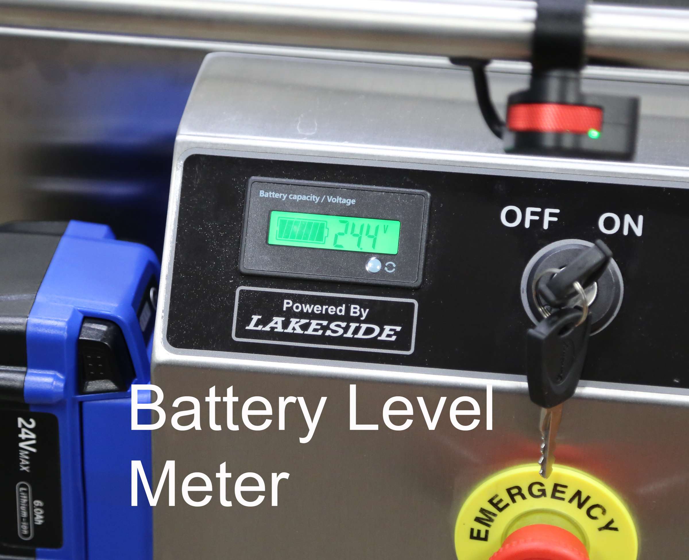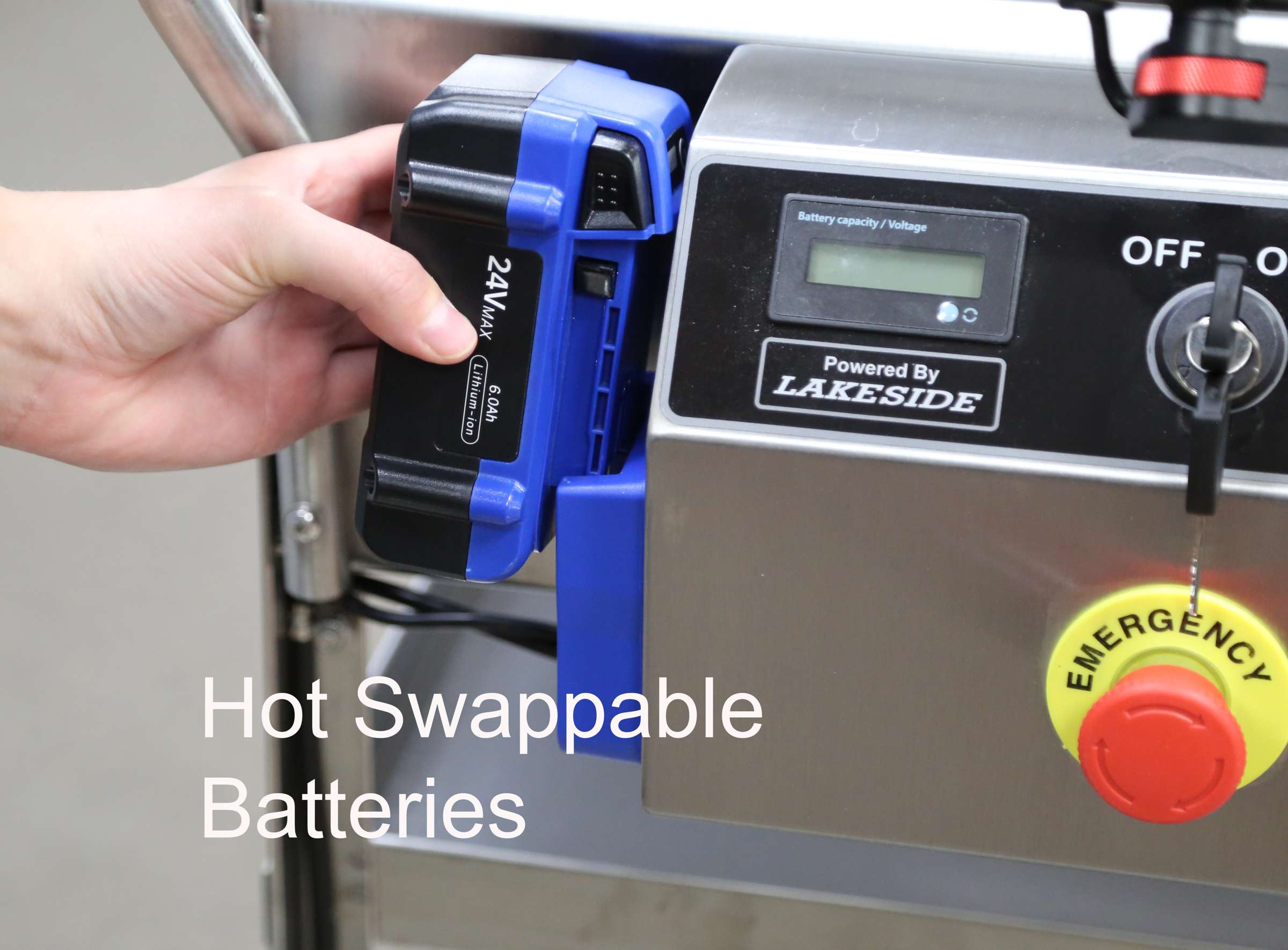 Product Specification: Lakeside model 173670 is of welded stainless steel U-frame construction. Shelves are 18-gauge and U-frame is 1” x 1” x 1/8” angle stainless steel. The battery-operated power system features 2 ea. power assist wheels. Wheel motion is controlled by an end-mounted thumb action control panel with emergency stop button and battery level meter. Motion system is powered by dual hot-swappable and rechargable 24V lithium-ion batteries providing two hours of continuous use. Casters are two each non-marking 6” wide tread swivel casters with brake, and 2 each front end mounted power hub casters.