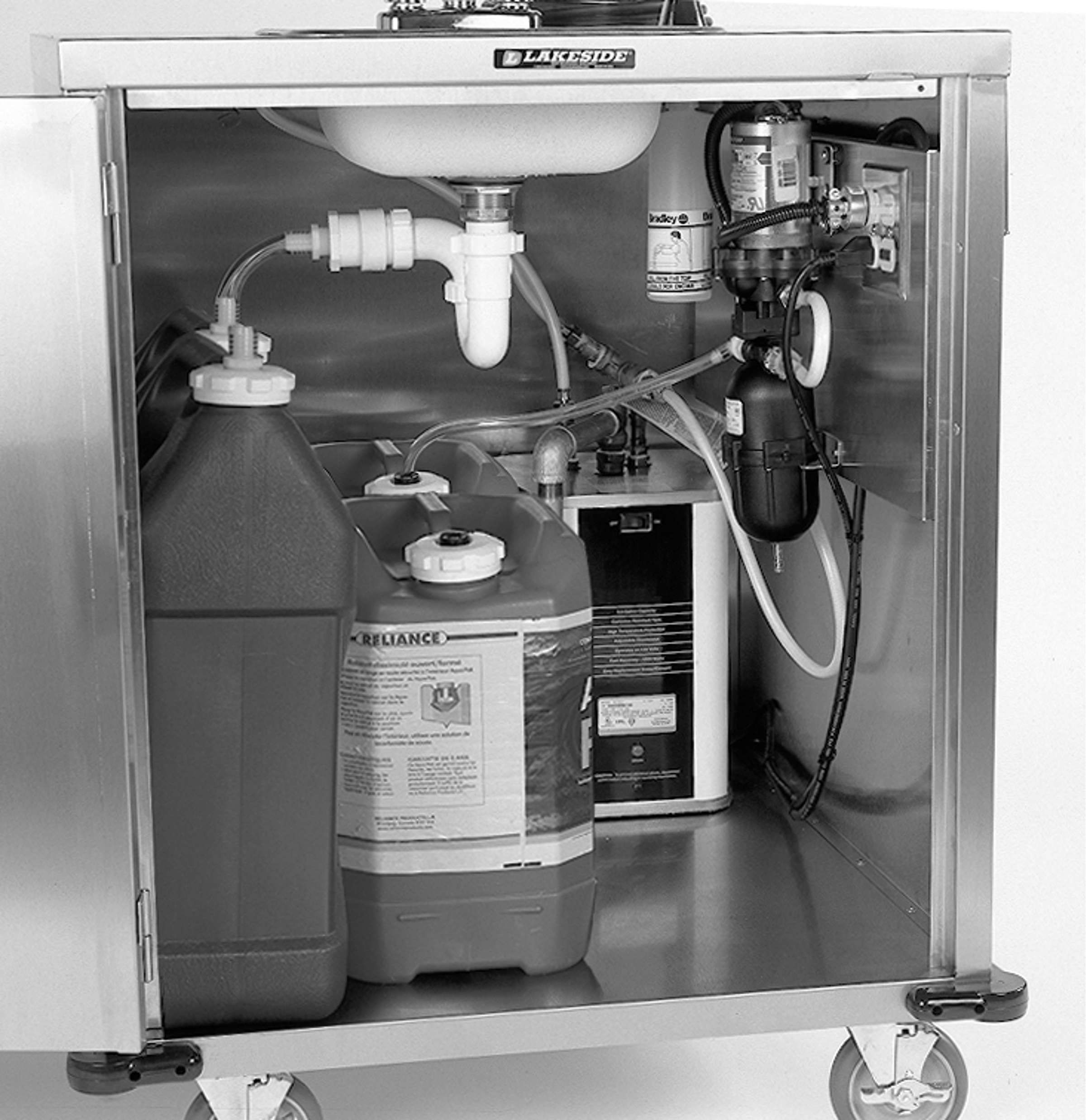 Product Specification: Shall be Model (9600, 9610, 9620), and feature welded stainless steel cabinet construction. Unit has one (two) each removable 5-gallon tank(s) for fresh water supply, and one (two) each 7-gallon tank(s) for waste water storage. Top features drop-in stainless steel sink bowl with drain and pump soap dispenser. Faucet is chrome plated brass with wrist blade control(s). Built-in water pump is 150 psi, 115 VAC, 0.9 amp, with automatic demand (no priming required), and features backflow protection to prevent fresh water contamination. Access door features recessed paddle latch with security key lock. Bottom corner bumpers are standard on Model 9600 and 9620. Casters are 5" non-marking, two each fixed and two each swivel with brake.
